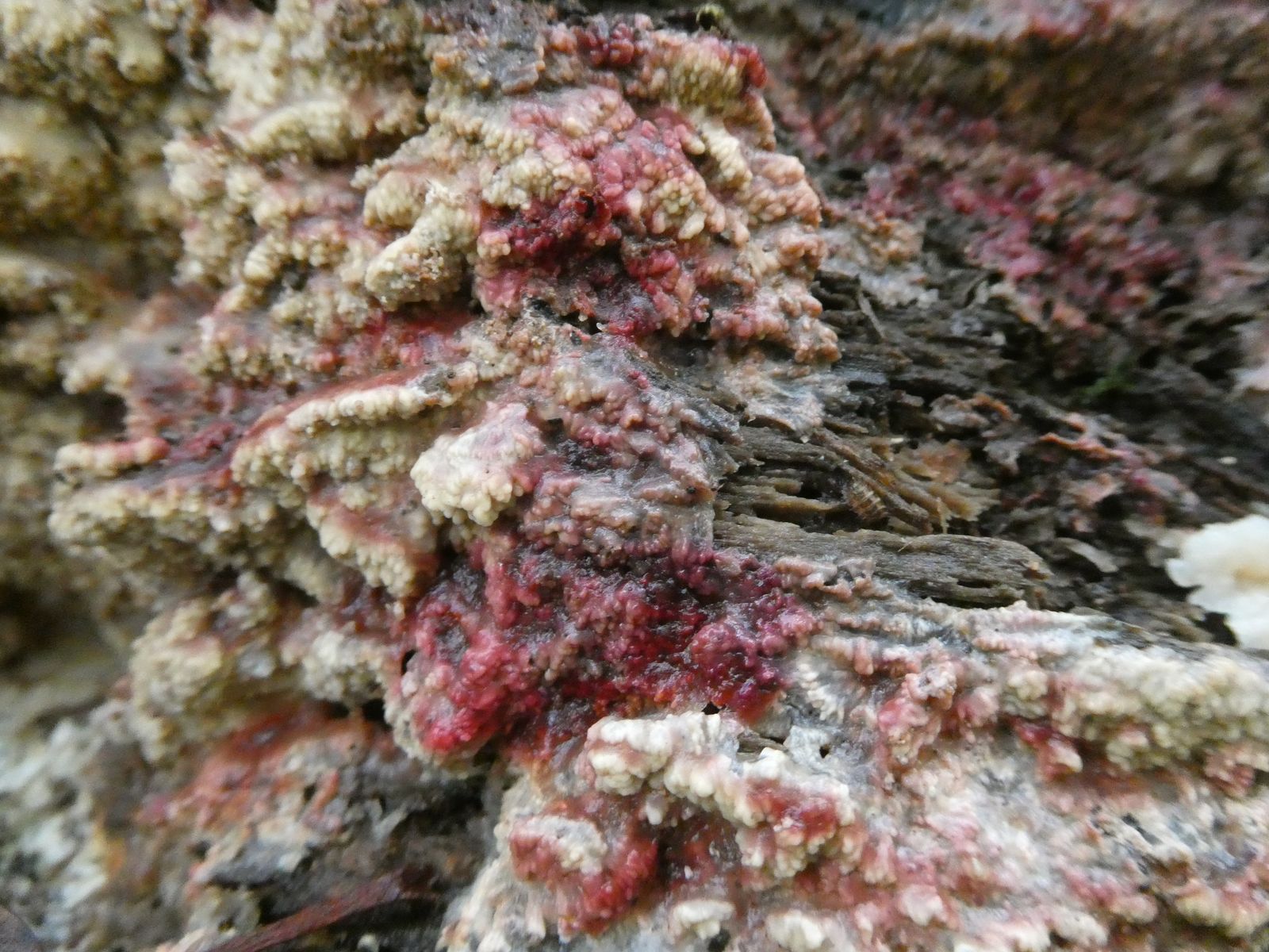 das ist Phlebia centrifuga, der Heidelbeer kammpilz. An ein paar Stellen kann man das normalerweise stärker ausgeprägte Heidelbeerfarbene schon erkennen.