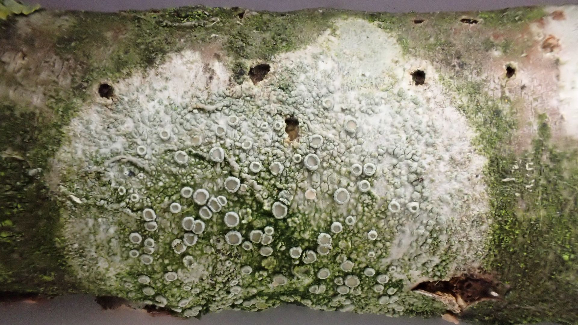 Es könnte vielleicht eine Flechte aus dem Lecanora / Glaucomaria carpinea-Komplex sein, die bräunliche, weiß bereifte Apothecienscheiben besitzen und an glatter Laubbaumrinde vorkommen.