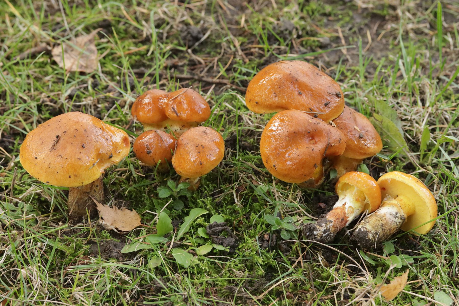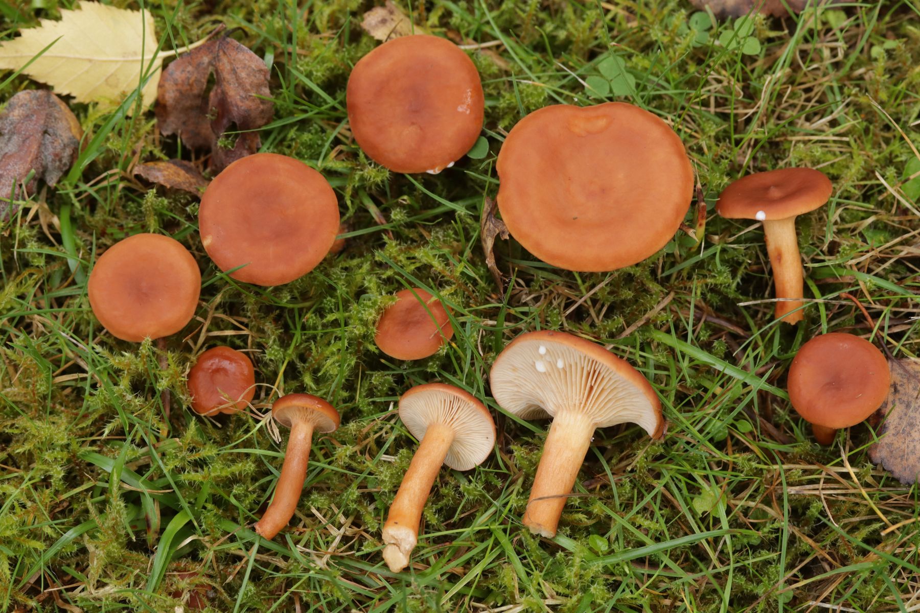 5. Und hier ein Lactarius, der uns Kopfzerbrechen bereitet. Wie der Vergleich mit den Birkenblättern zeigt mit relativ kleinen Fruchtkörper. Die Hutoberfläche ist glatt, reagiert mit KOH leicht grünlich. Die Lamellen besitzen einen herablaufenden Zahn. Die Milch ist anfangs mild, wenn auch mit unangenehmen, leicht bitteren Geschmack und wird nach einiger Zeit minimal schärflich. Fundort war eine magere Wiese, die beidseitig mit Birken umrahmt war. Die Sporen zeigen ein teilweise netziges Ornament. Wenn man mit den Informationen in den Schlüssel I von Fungi of Northern Europe Band 2 geht schlüsselt man sich über 1 -> 4 -> 5 -> 10 -> 14 -> 17. Wegen der glatten Huthaut geht es weiter nach 19 und von dort wegen der Birken nach 22. Pelargoniengeruch fehlt ->23. Von dort aus kann man wegen fehlender Buch L. subdulcis ausschließen und landet bei 25. Von dort mit herablaufendem Zahn nach 27. Die Milch verfärbt nicht deutlich gelblich, also ist L. duplicatus raus und es bleiben letztlich L. lacunarum und L. fulvissimus. Die netzig ornamentierten Sporen sprechen für L. lacunarum, der Standort eher für L. fulvissimus. Was meinen die Expert:innen?