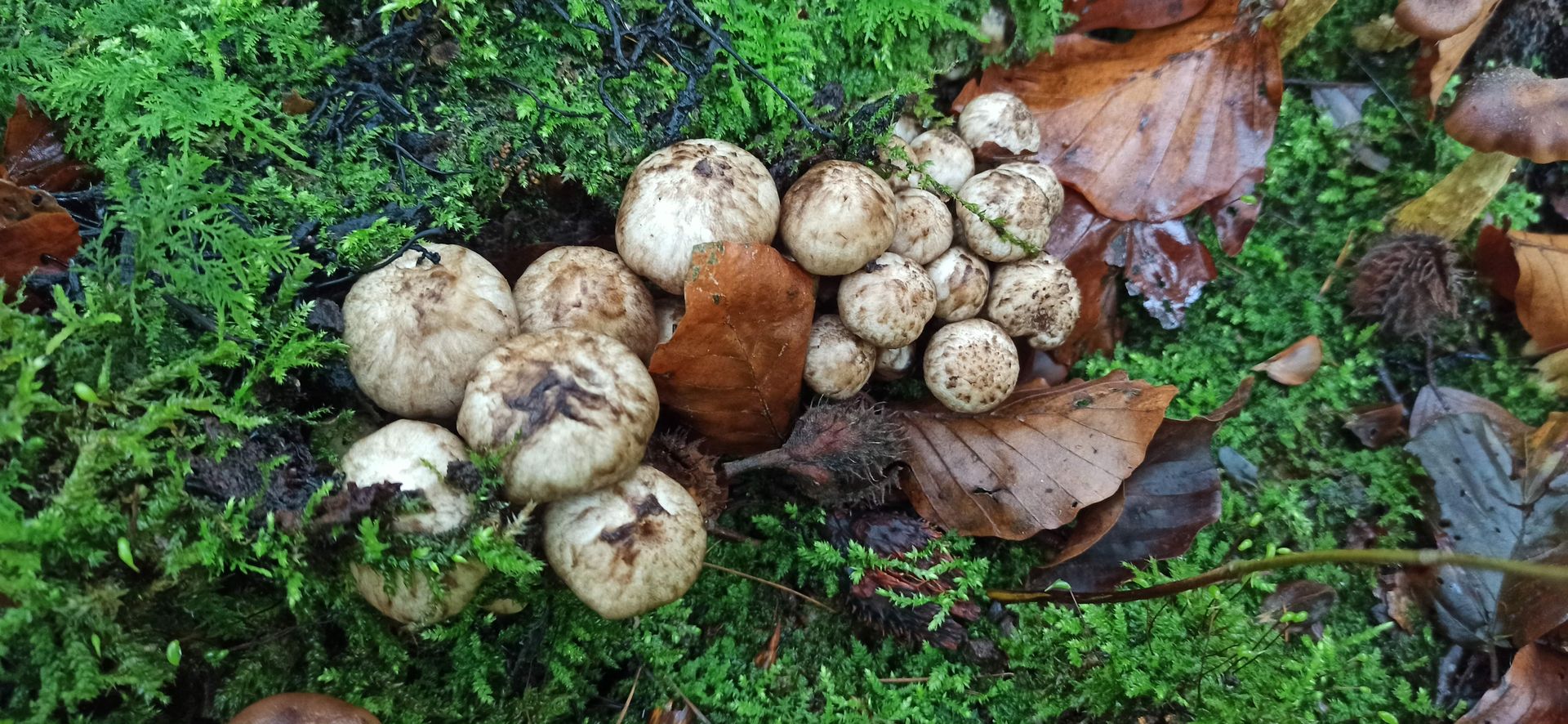 Aus einer liegenden Buche ist büschelig ein grauer Schüppling heraus gewachsen. Auffällig ist die rötende Stielbasis. Was denkt ihr? Eine Albino Variante vom Rötenden Schüppling? Hut schmierig.