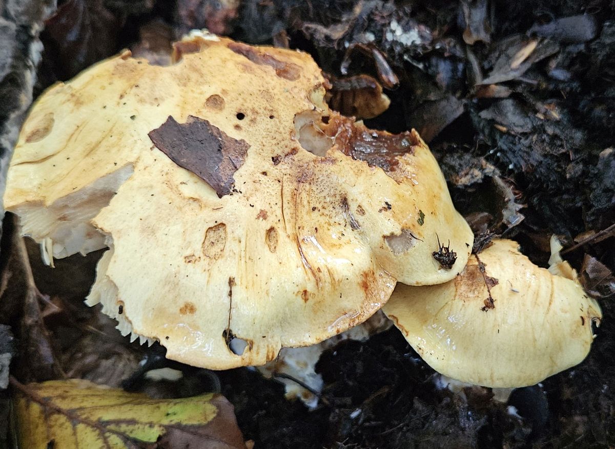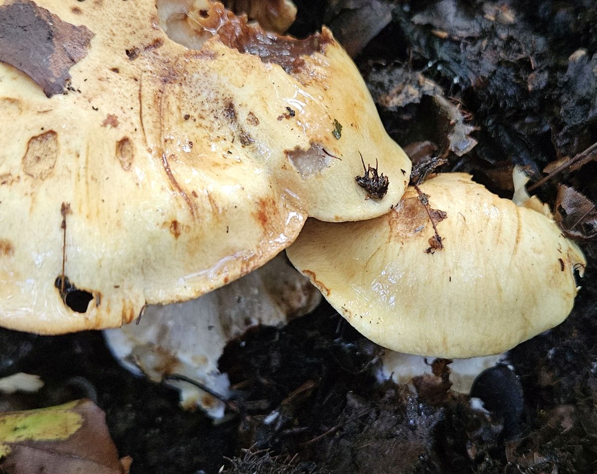 Der Hut ist jung halbkugelig, später ausgebreitet; die Hutfarbe ist ein sehr helles gelb/ocker, am Hutrand heller. Verletze Stellen in der Huthaut wie Frasstellen oder wie Kratzer verfärben sich bräunlich. In der Hutmitte findet man beim älteren Exemplar kleine dunkle Schüppchen.