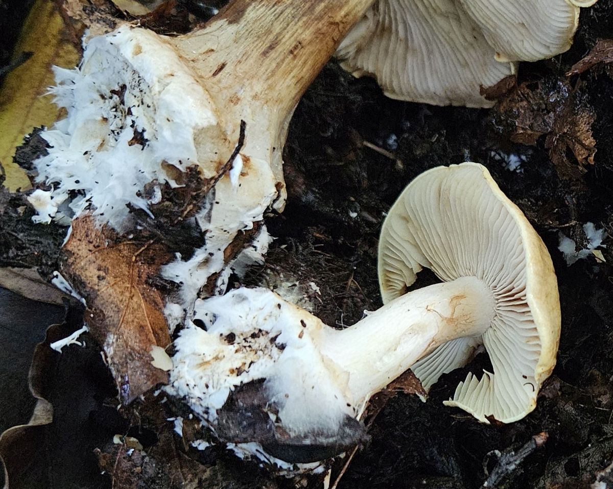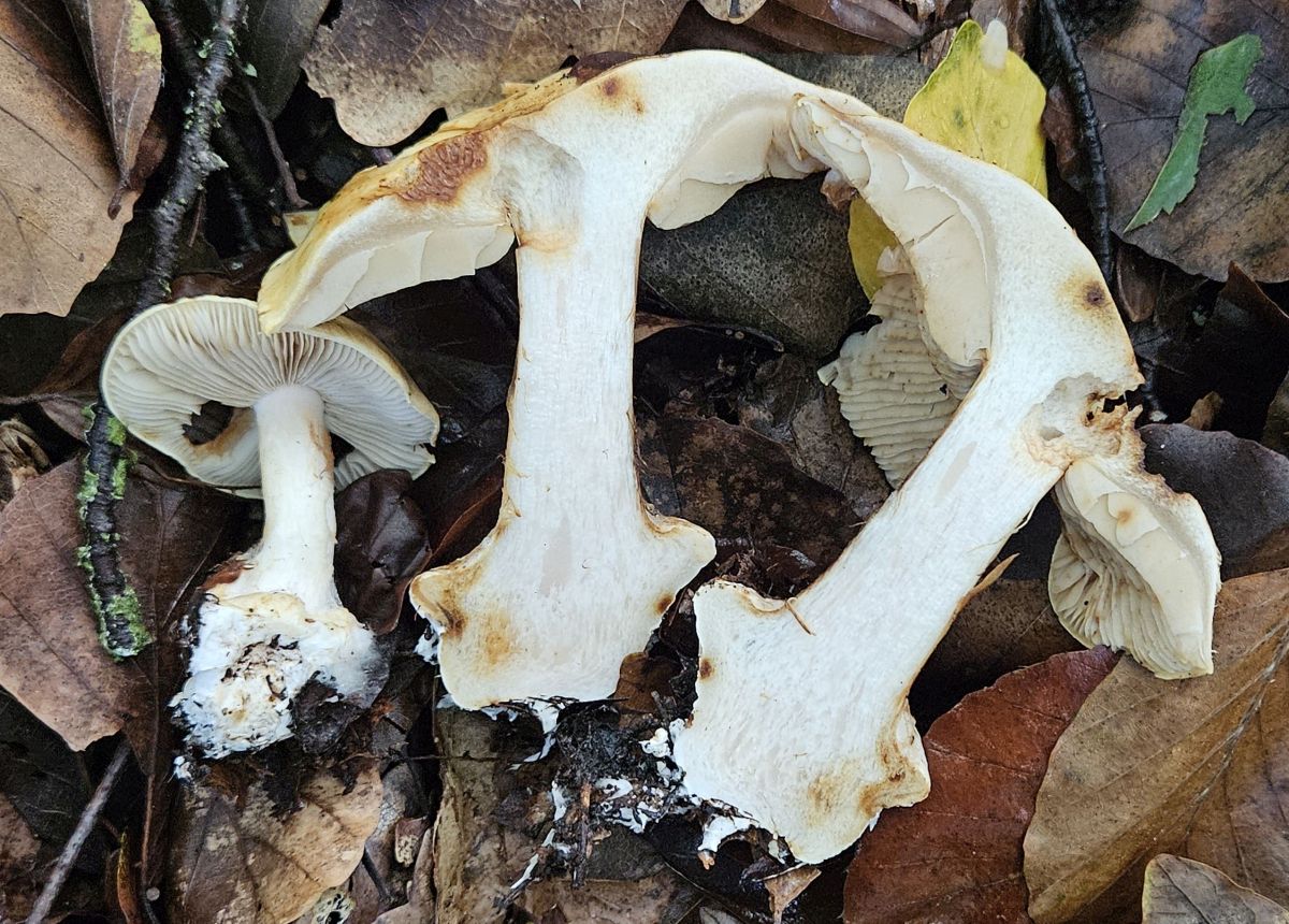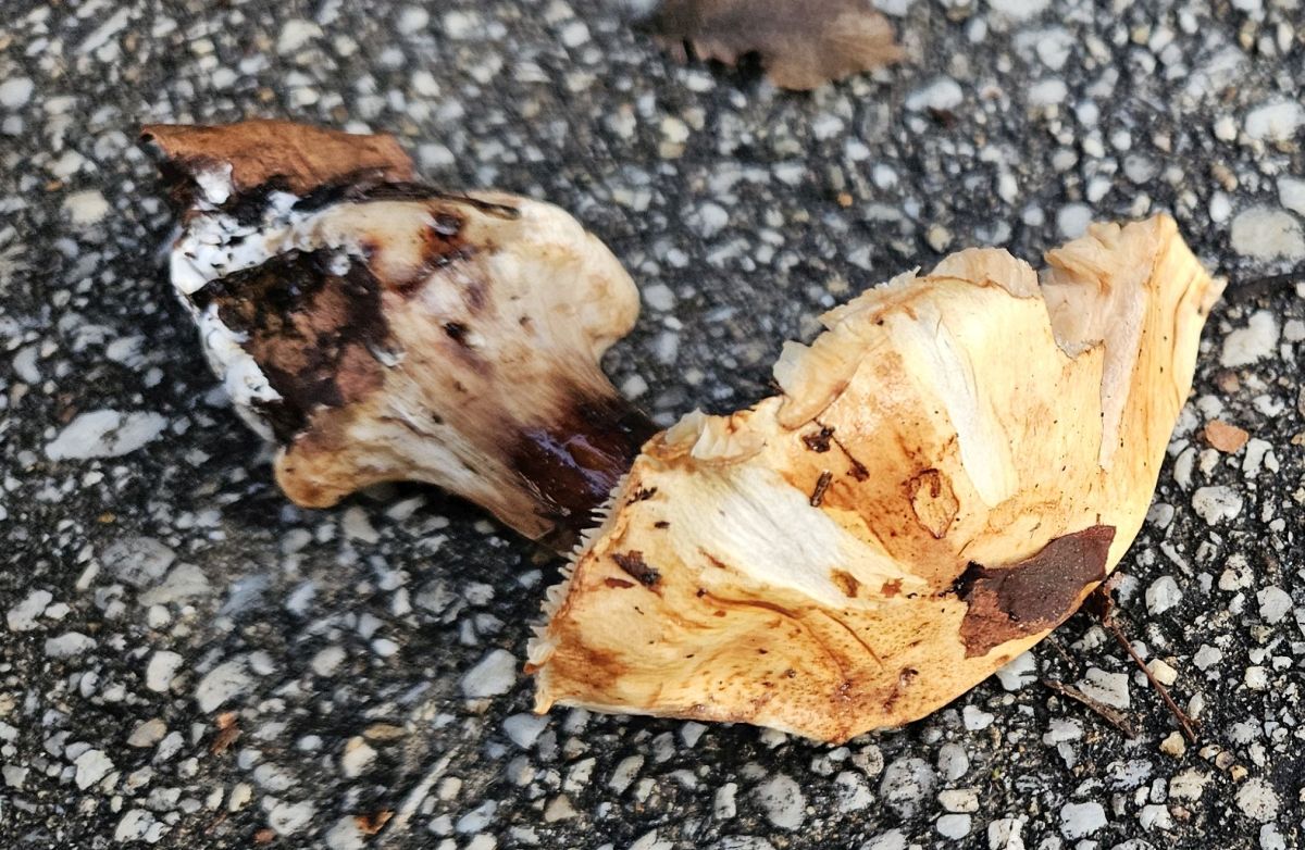 Das Fleisch ist weißlich, an manchen Stellen marmoriert wirkend. Hier und da findet man dunkle bräunliche Flecken.
