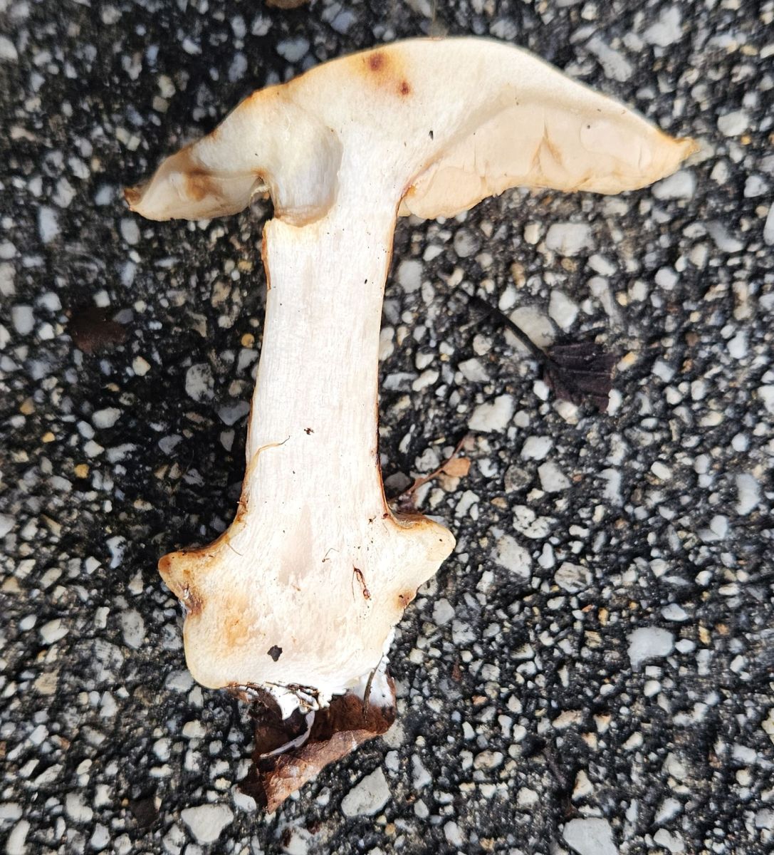 Der Stiel von jungen Exemplaren ist cremefarben und hat +- die gleiche Farbe wie die jungen Lamellen. Im Alter ist er dunkel überfasert. Die Knolle ist auffällig breit und hat im Schnitt eine Art Trapezform. Die Knollenhaut ist weiß, ebenso das Basismycel.