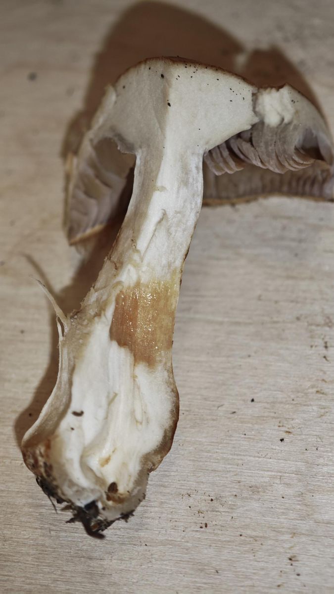 Ich dachte hier zuerst eigentlich an Cortinarius varius, aber die Lamellen waren sehr blass und hatten nur einen schwachen Lilaton. Auch der Hut war eher blass. Der violette Ring am Lamellenansatz am Stiel, der ja für C. varius typisch ist, war aber sehr gut zu sehen. Also habe ich mal im Ludwig unter C. varius geschaut und dort unter Verwechslungsmöglichkeiten von Cortinarius decolorans folgendes gelesen: "Ist meist schmächtiger, der Hut blasser gelb, gelbocker, die Lam. nur schwach lila. Anscheinend sehr selten."