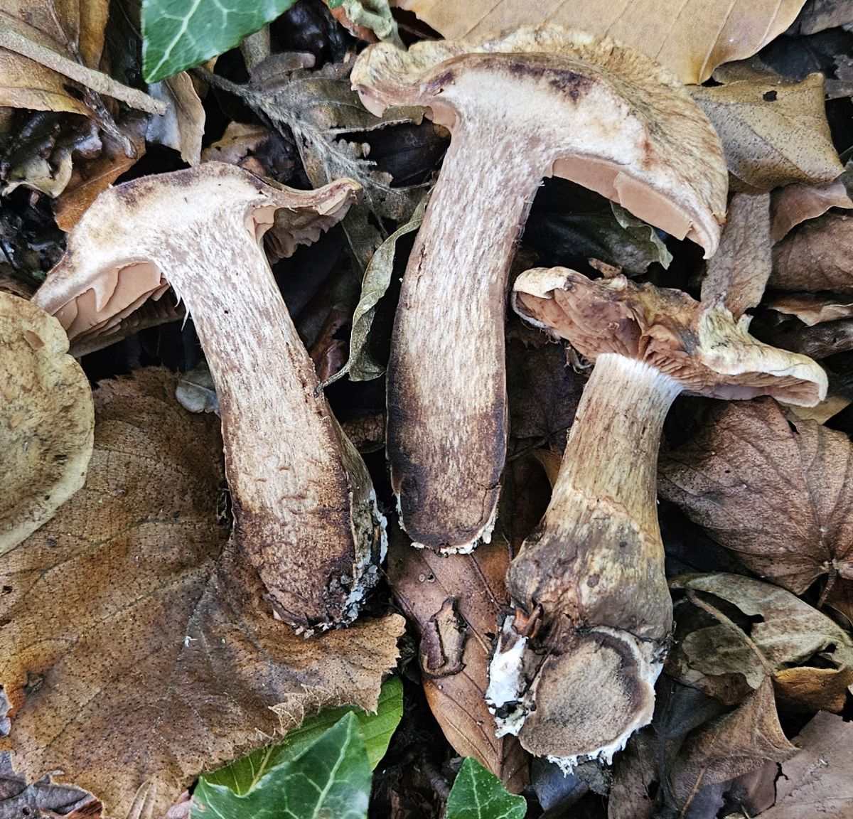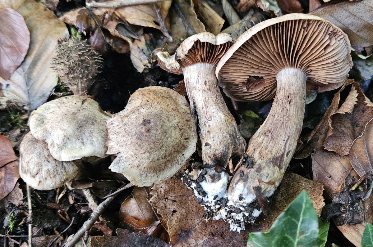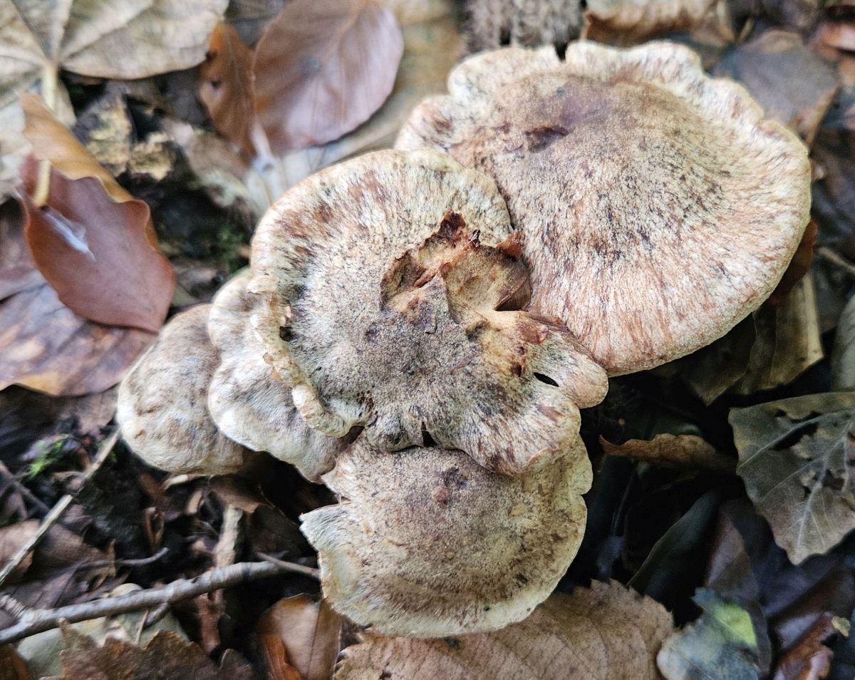 normalerweise bücke ich mich nicht nach Telamonien, obwohl bei uns die Laubwälder gerade wirklich voll damit stehen. Diese kleine Gruppe mit recht robusten Fruchtkörpern fand ich aber derart auffällig, dass ich leichtsinnigerweise hoffte man könne sie einigermaßen leicht bestimmen.
