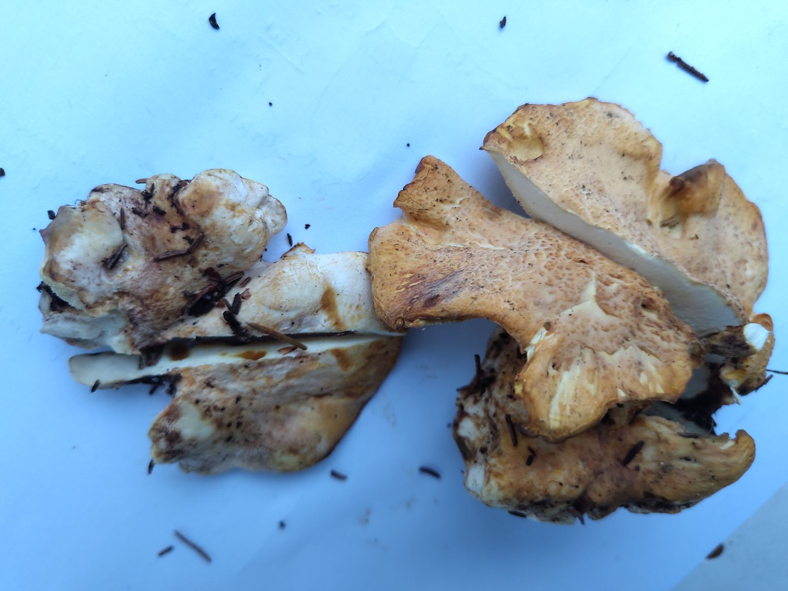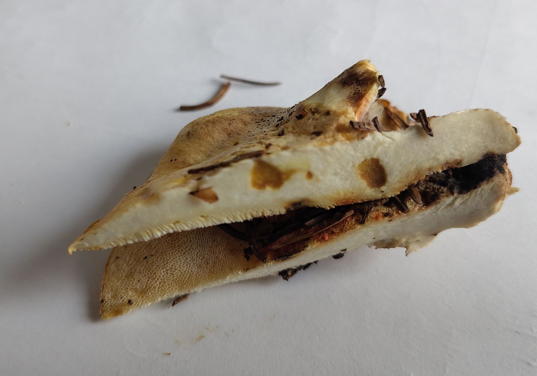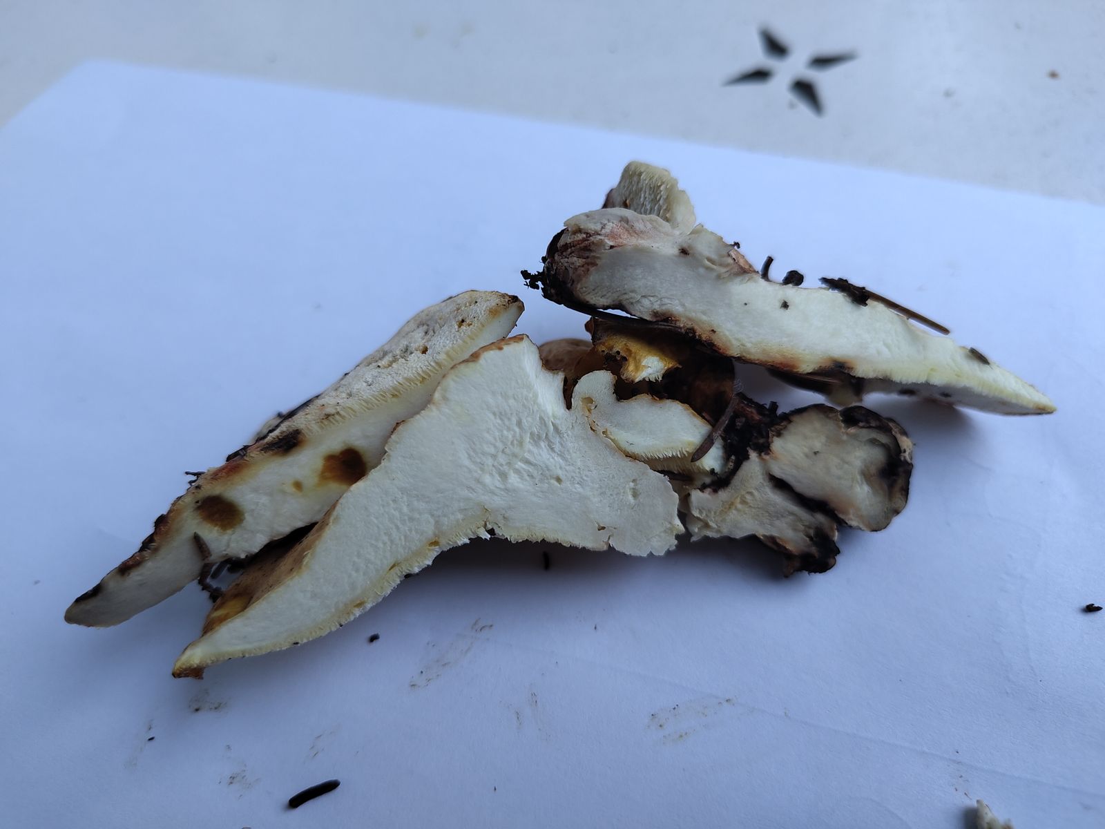 7) Das Stielfleisch schwärzt etwas nach einigen Minuten (im Vordergrund rechts oben), was auch auf A. citrinus hinweist.