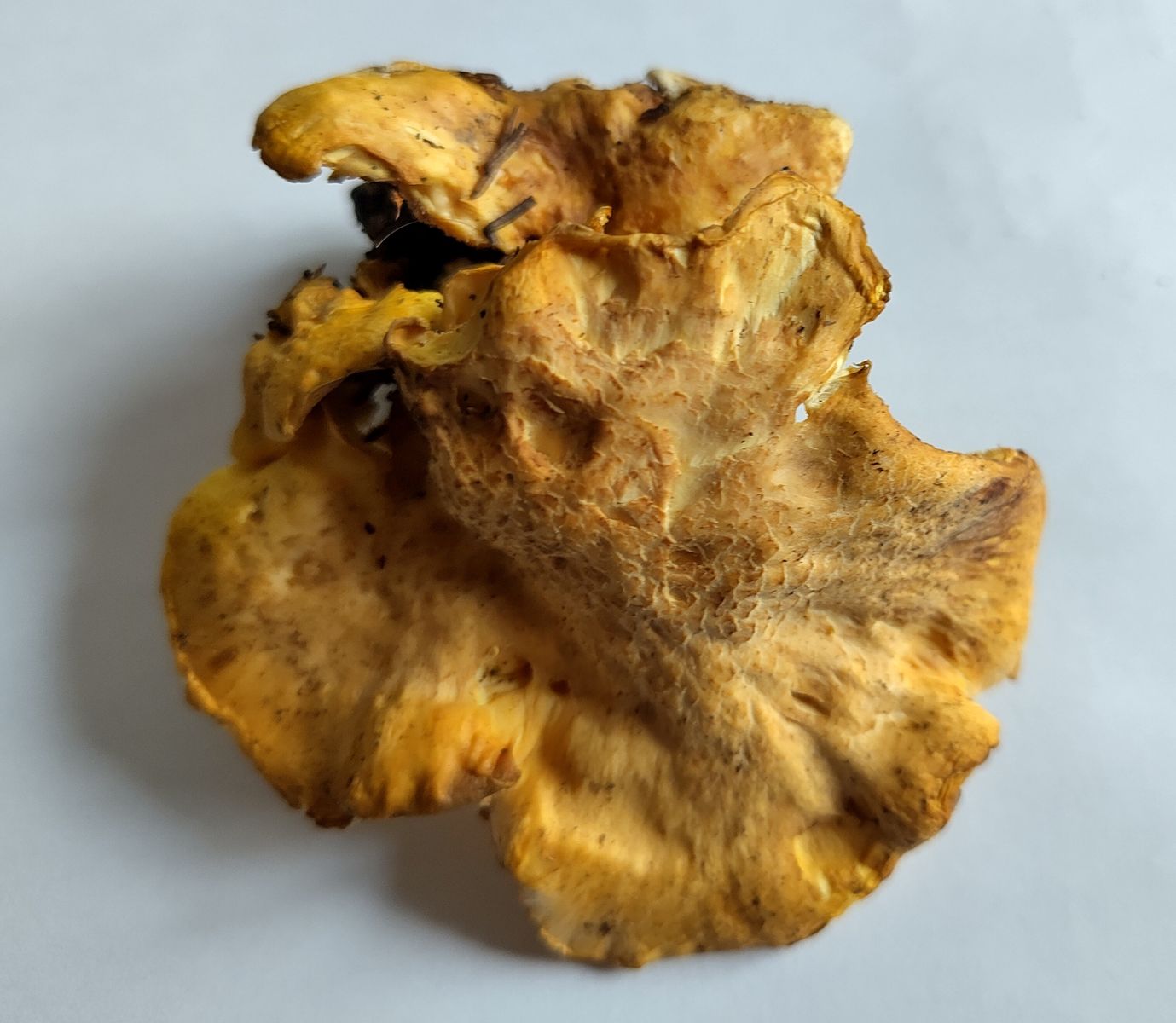 1) Der grösste Fruchtkörper, welcher die anderen vor der Sonne schützte ist sehr gelb. Farblich wirkt er auf mich wie ein Amethystpfifferling, da die aufgeplatze Huthaut etwas bräunlich wurde.