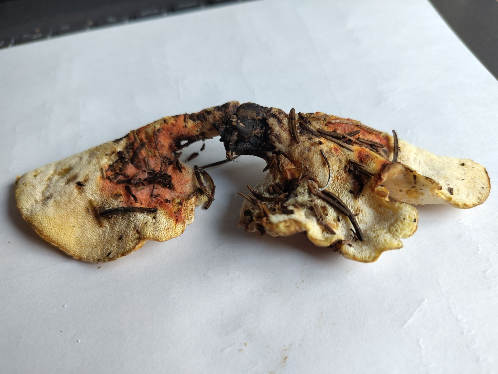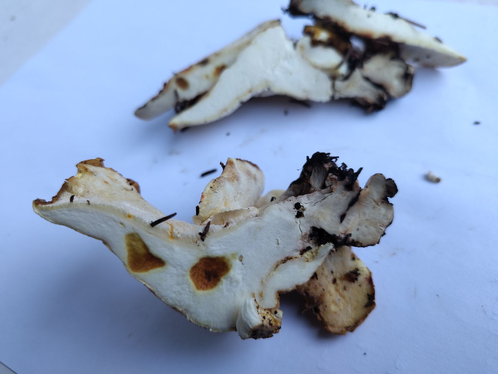2) Der darunter wachsende kleinere Fruchtkörper (links) ist weiss-gelblich.