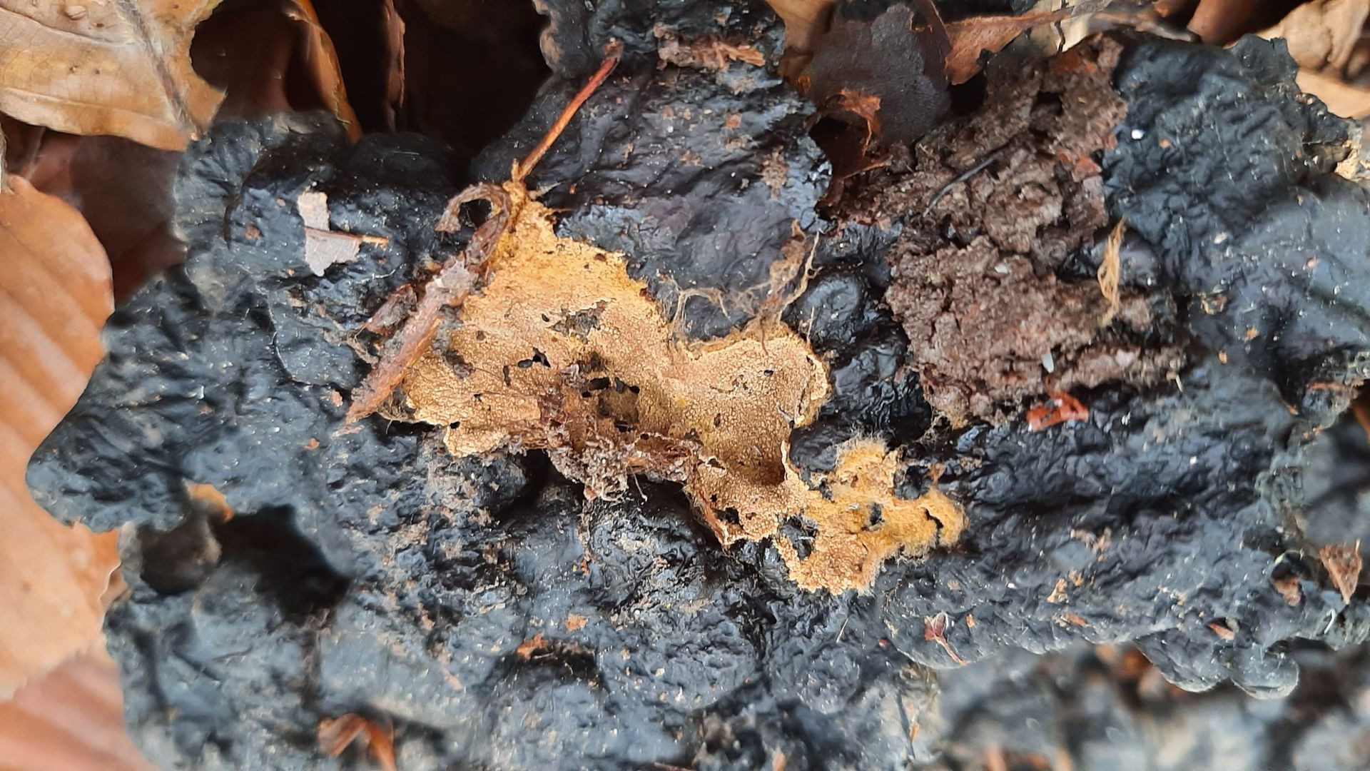 Heute habe ich diese Gebilde im Wald gesehen, letztes Jahr hatte ich in einiger Entfernung dort Eichhasen gesehen. Könnte das ein Eichhasen Sklerotium sein? Das etwa handgrosse und handdicke Gebilde hatte keinerlei Verankerung mit dem Waldboden, es lag lose auf dem Blattwerk herum. Müsste ein Sklerotium nicht irgendwie dauerhaft im Boden " verankert" sein oder ist das möglicherweise von Wild ausgegraben worden?