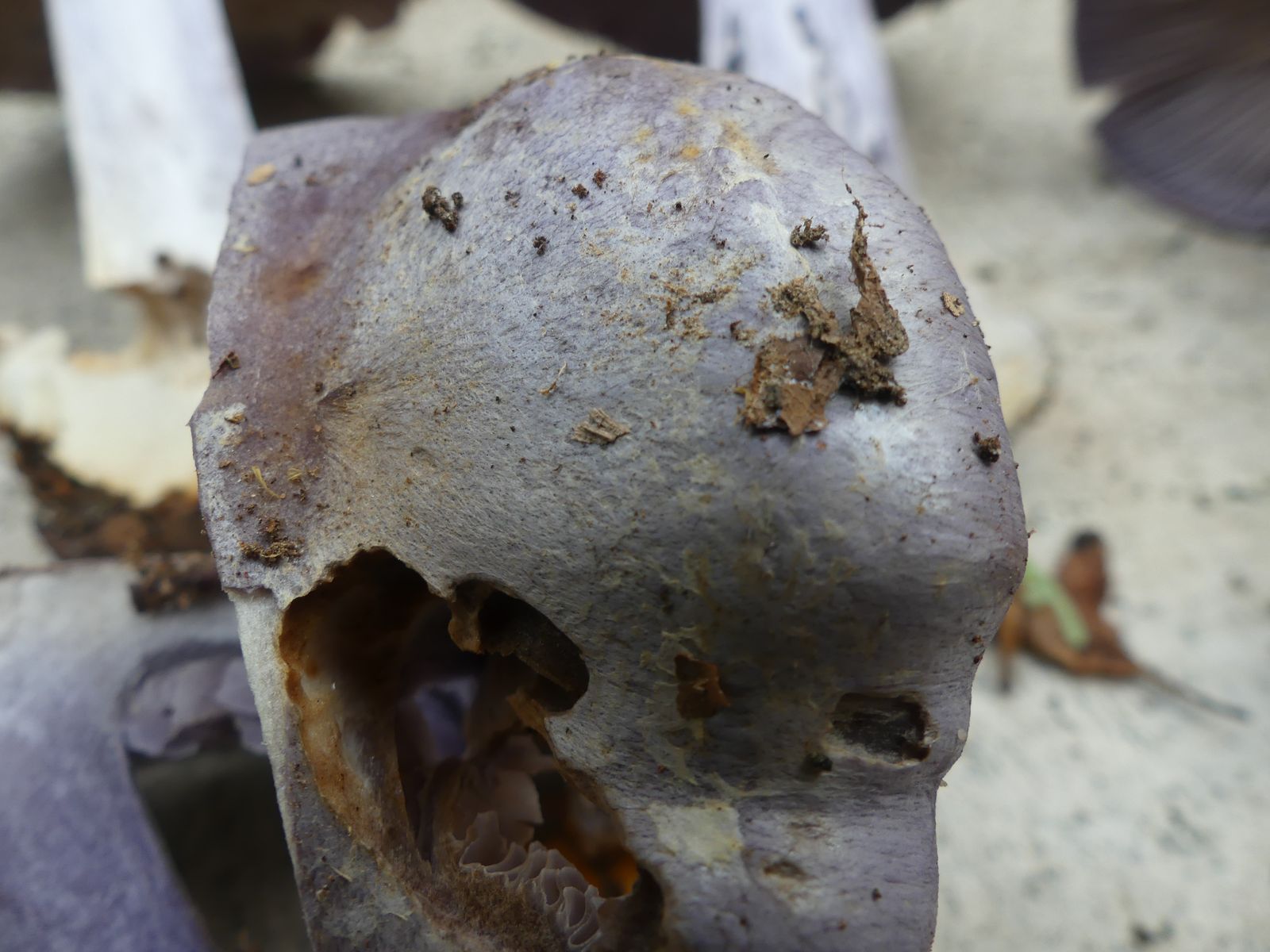 Bei blauen Klumpfüßen ist es nützlich, KOH auf den Hutrand, den Knollenrand und die Knollenunterseite zu schmieren. Manchmal hat man Glück und bekommt eine rote oder pinke Farbreaktion, was den Bestimmungsaufwand erheblich abkürzen kann.