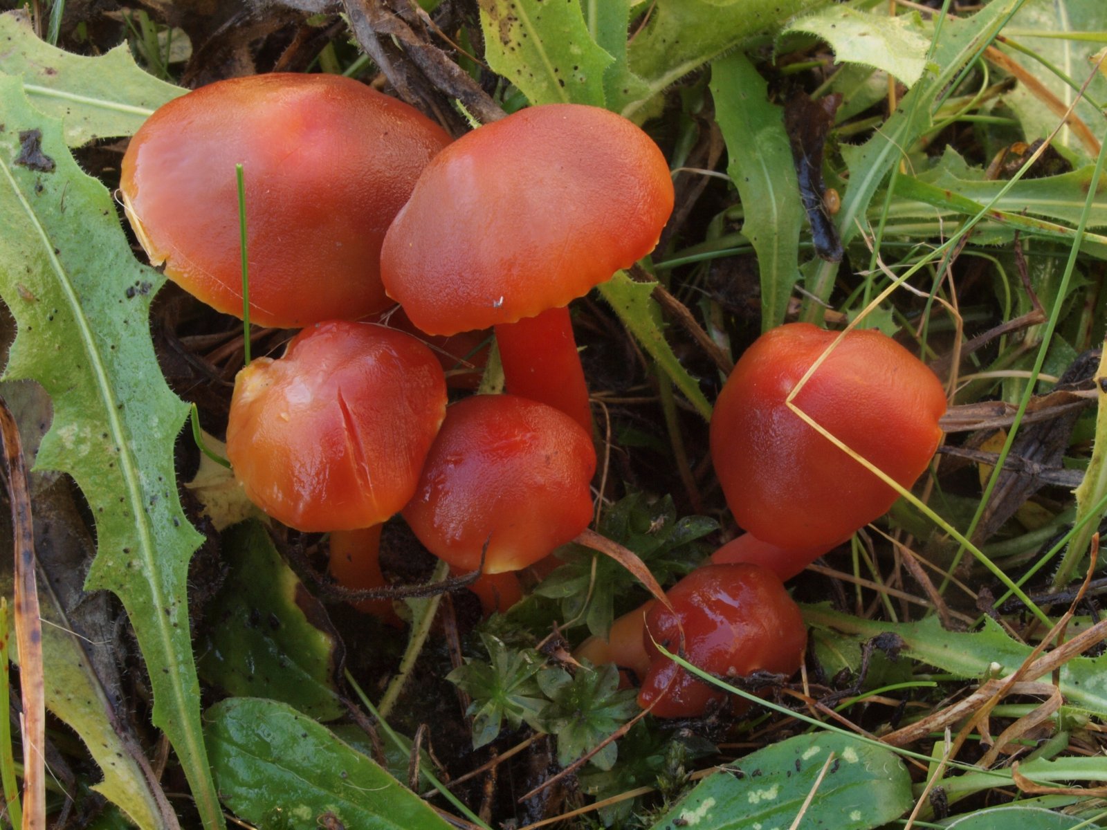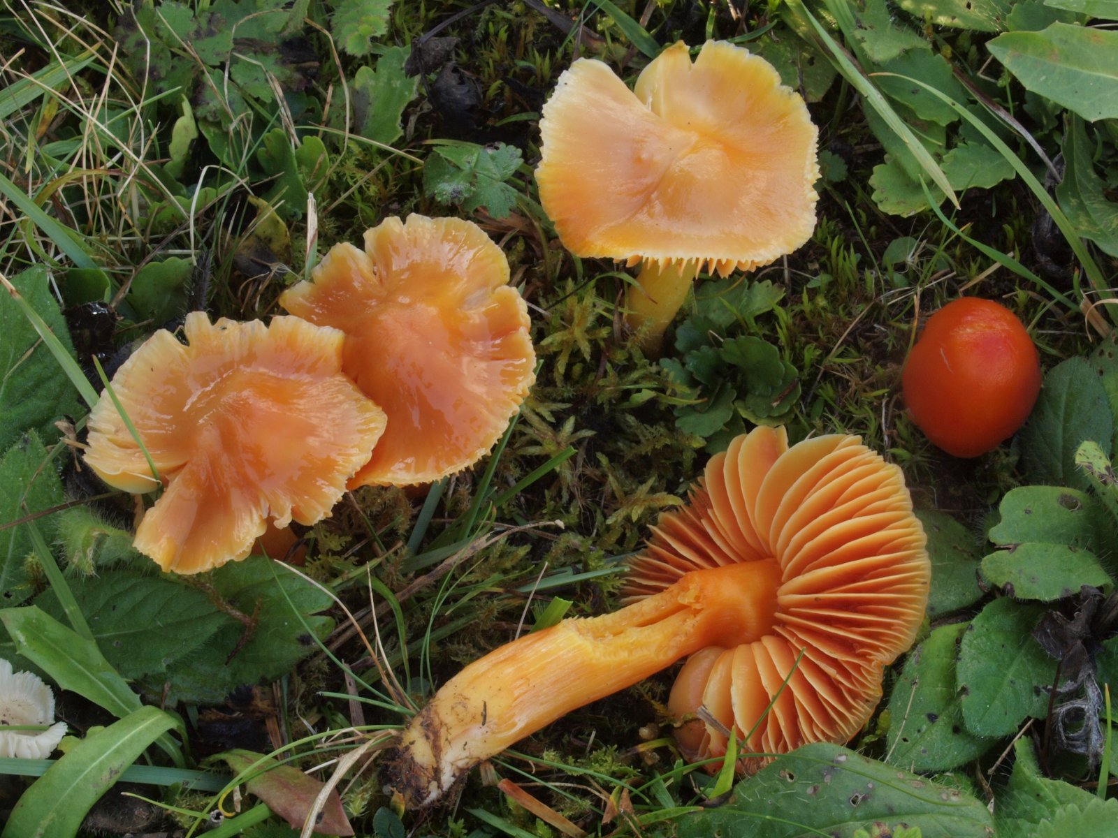 Dann kam noch ein Knaller. Mehr oder weniger rote Saftlinge mit sehr schleimigen Hüten erinnerten zunächst an den Ziegelbraunen Saftling, aber die vollständig trockenen Stiele passen absolut nicht dazu. Auch die später hinzugezogenen Wiesenpilzkenner konnten der Art keinen Namen geben. Wolfgang P. glaubt an eine noch unbeschriebene Art