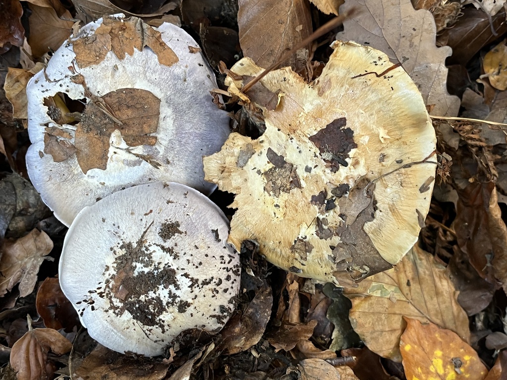 2. Bei der zweiten Kollektion waren Fruchtkörper und Lamellen jung bläulich bis blauviolett gefärbt. Allerdings fanden sich auch ältere Fruchtkörper, bei denen die Hüte fast komplett bräunlich gefärbt waren, ebenfalls die Stiele. Es handelt sich demnach um eine der im Alter verfärbenden Arten.