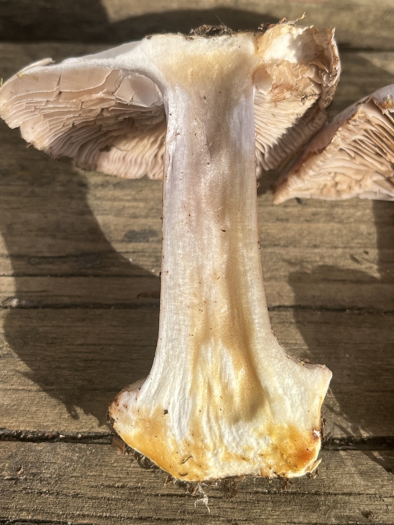 3. Von der dritten Art war leider nur ein junger Fruchtkörper vorhanden. Die Hutfarben waren gelb und die Lamellen violett, es handelt sich demnach um eine Art aus der Sektion Calochroi. Die Art hatte ebenfalls einen violett überhauchten Stiel sowie eine violette Stieltrama. Die Trama war im Hut und in der Stielbasis ebenfalls weiß. Die KOH-Reaktion auf dem Hut viel schwach rötlich aus (habe ich leider nicht gut dokumentiert), die Reaktion in der Trama gelblich (hier bin ich mir sicher).