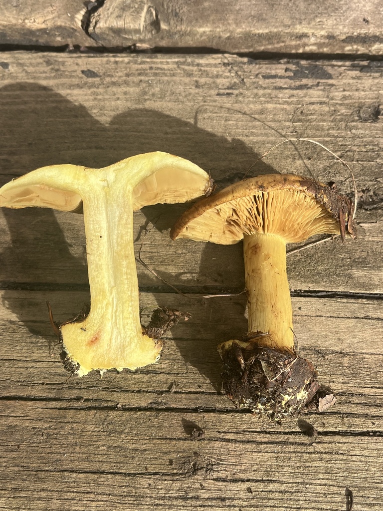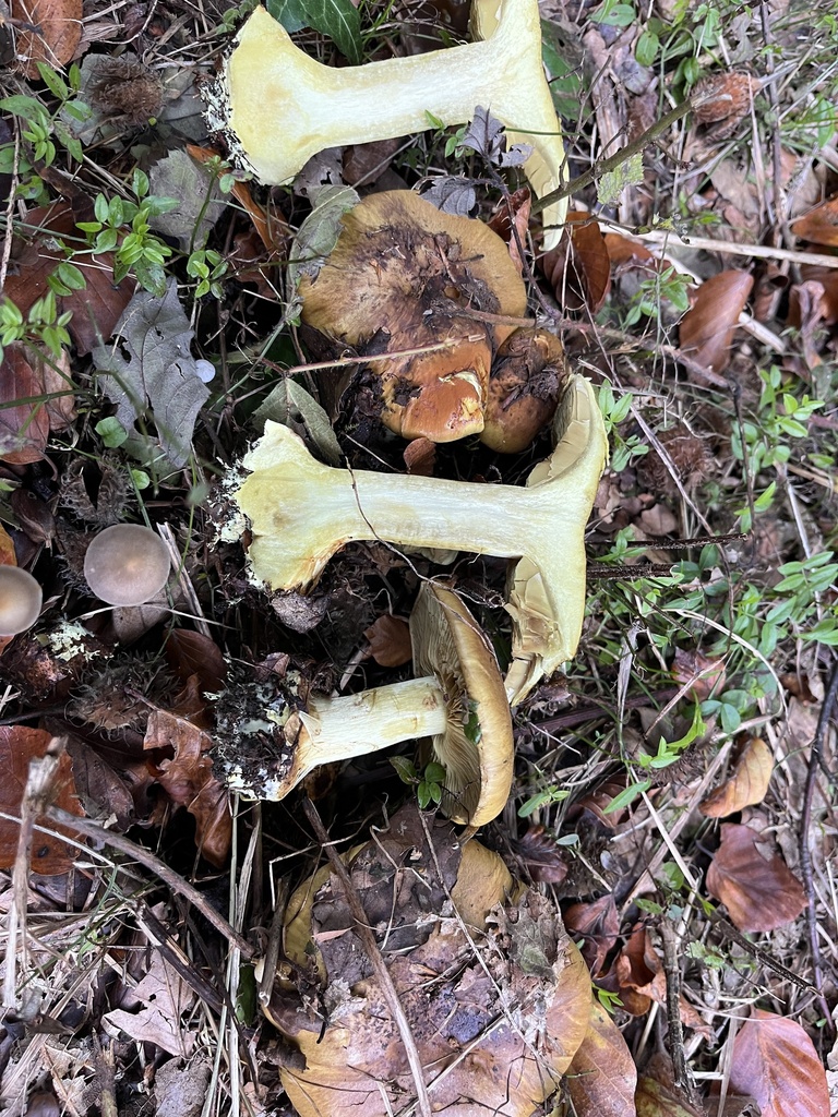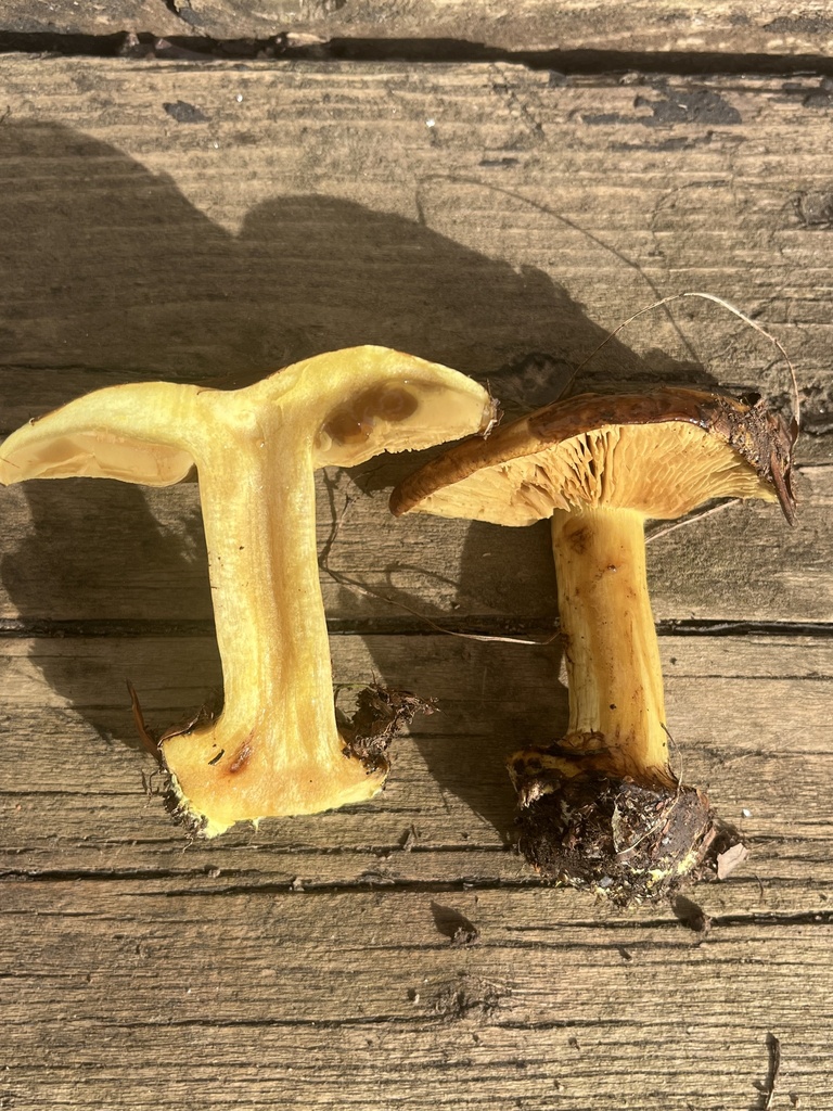 3. Von der dritten Art war leider nur ein junger Fruchtkörper vorhanden. Die Hutfarben waren gelb und die Lamellen violett, es handelt sich demnach um eine Art aus der Sektion Calochroi. Die Art hatte ebenfalls einen violett überhauchten Stiel sowie eine violette Stieltrama. Die Trama war im Hut und in der Stielbasis ebenfalls weiß. Die KOH-Reaktion auf dem Hut viel schwach rötlich aus (habe ich leider nicht gut dokumentiert), die Reaktion in der Trama gelblich (hier bin ich mir sicher).
