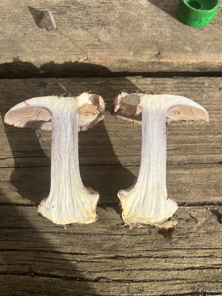 Die Huthaut war mild im Geschmack und die Stieltrama war blauviolett gefärbt. Die Trama der Stielbasis und des Huts waren weiß. Die KOH-Reaktion auf dem Hut viel blassrosa aus, im Fleisch war die Reaktion ockerfarben, an der Basis karottenrot (sehr auffälliges Merkmal mMn).