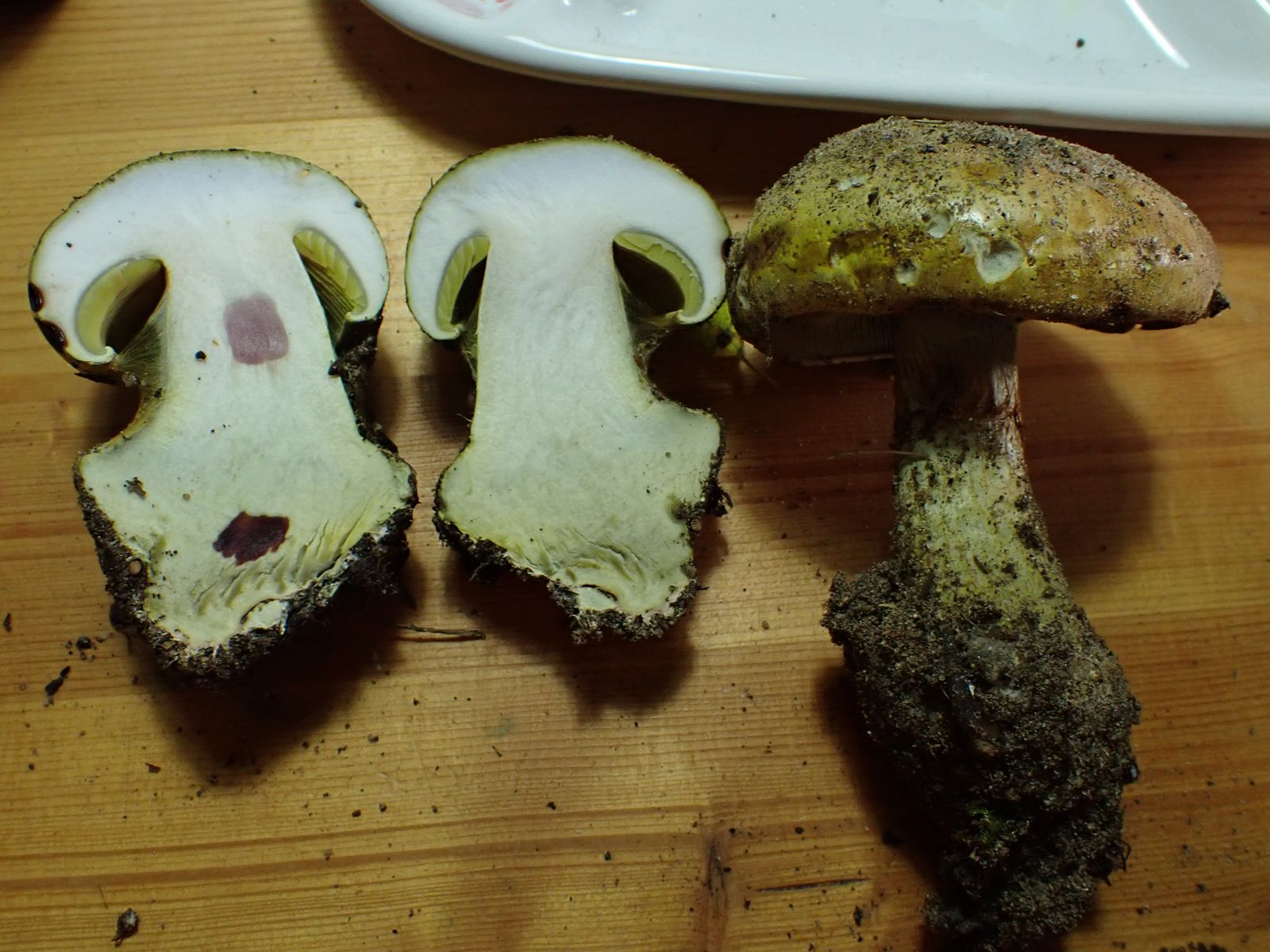 Er reagiert an Hut und Knolle tiefblutrot und im Fleisch im Stiel (gelblich) ebenso und dort, wo es weiß ist, etwas mehr rosarot und weniger tief.