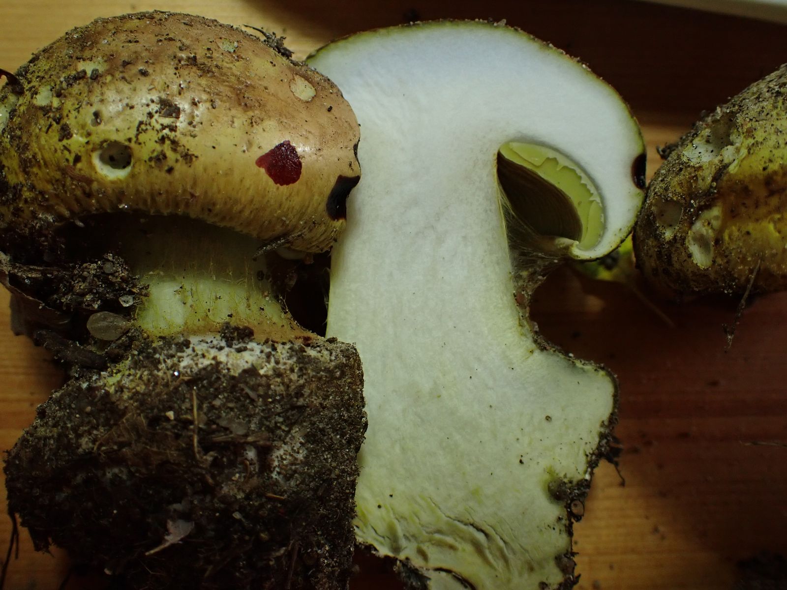 Er reagiert an Hut und Knolle tiefblutrot und im Fleisch im Stiel (gelblich) ebenso und dort, wo es weiß ist, etwas mehr rosarot und weniger tief.