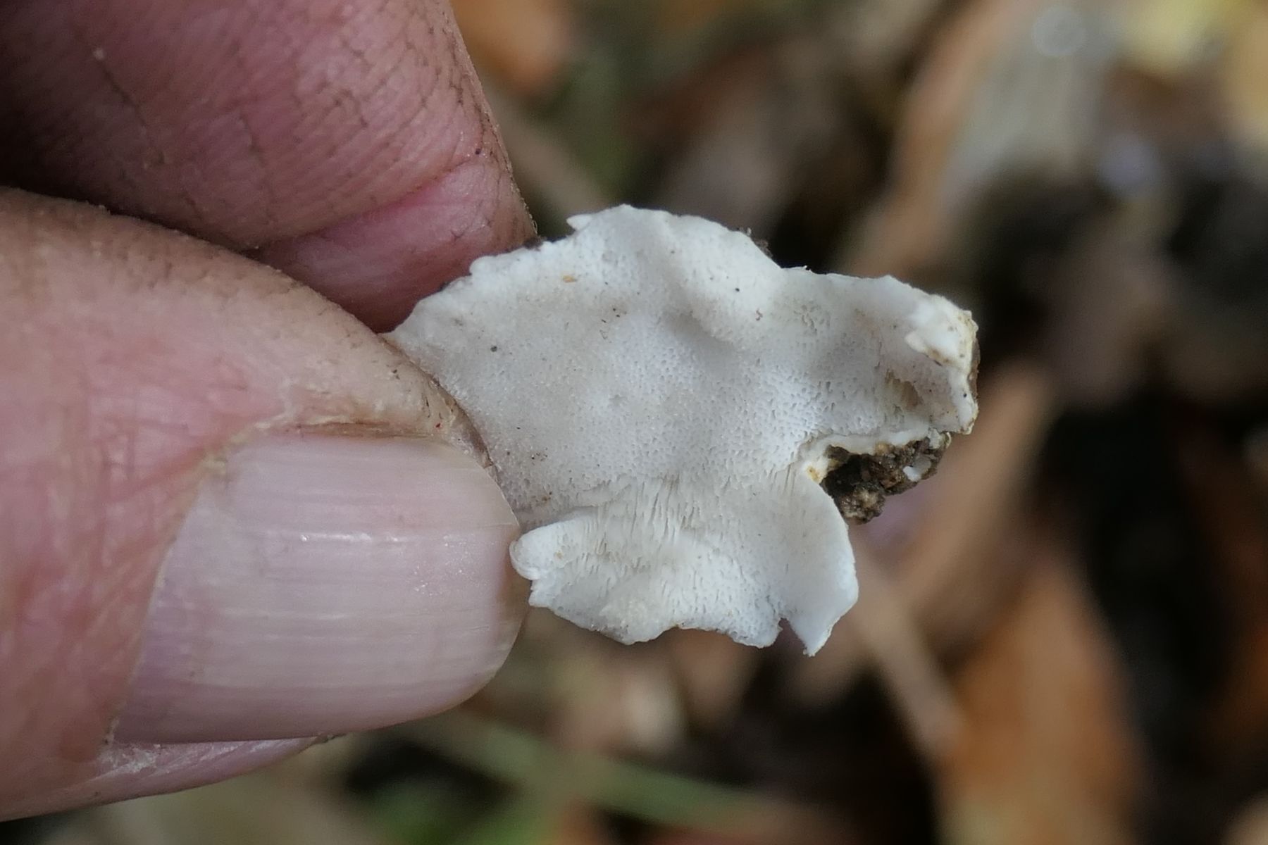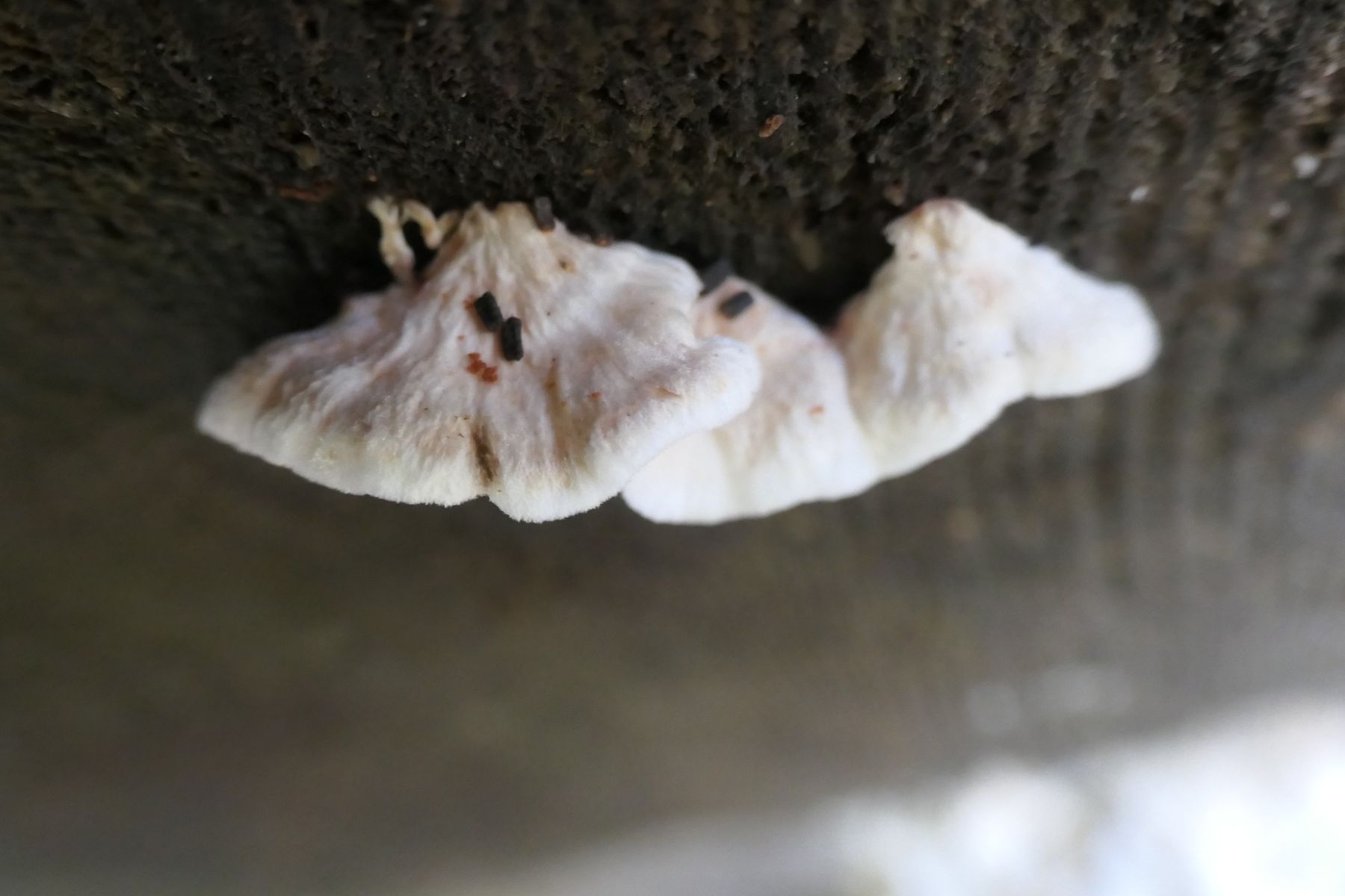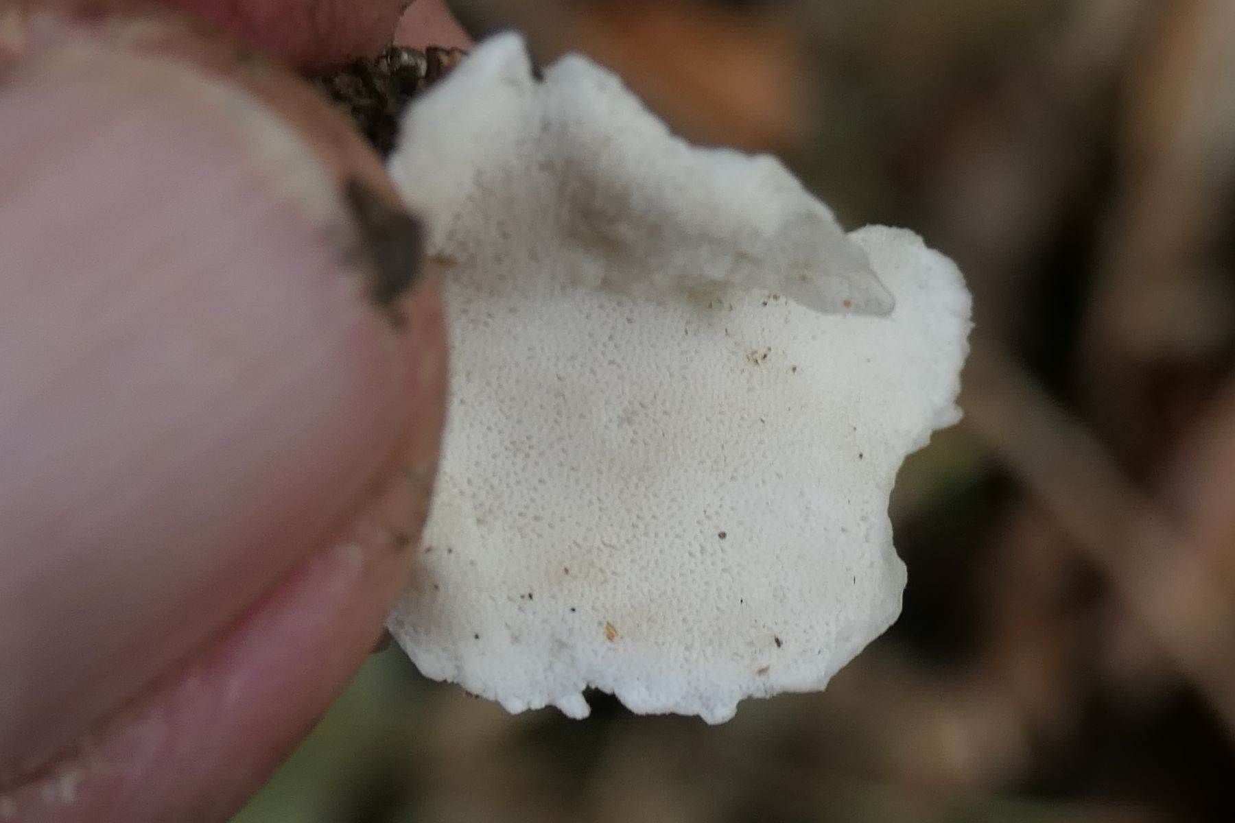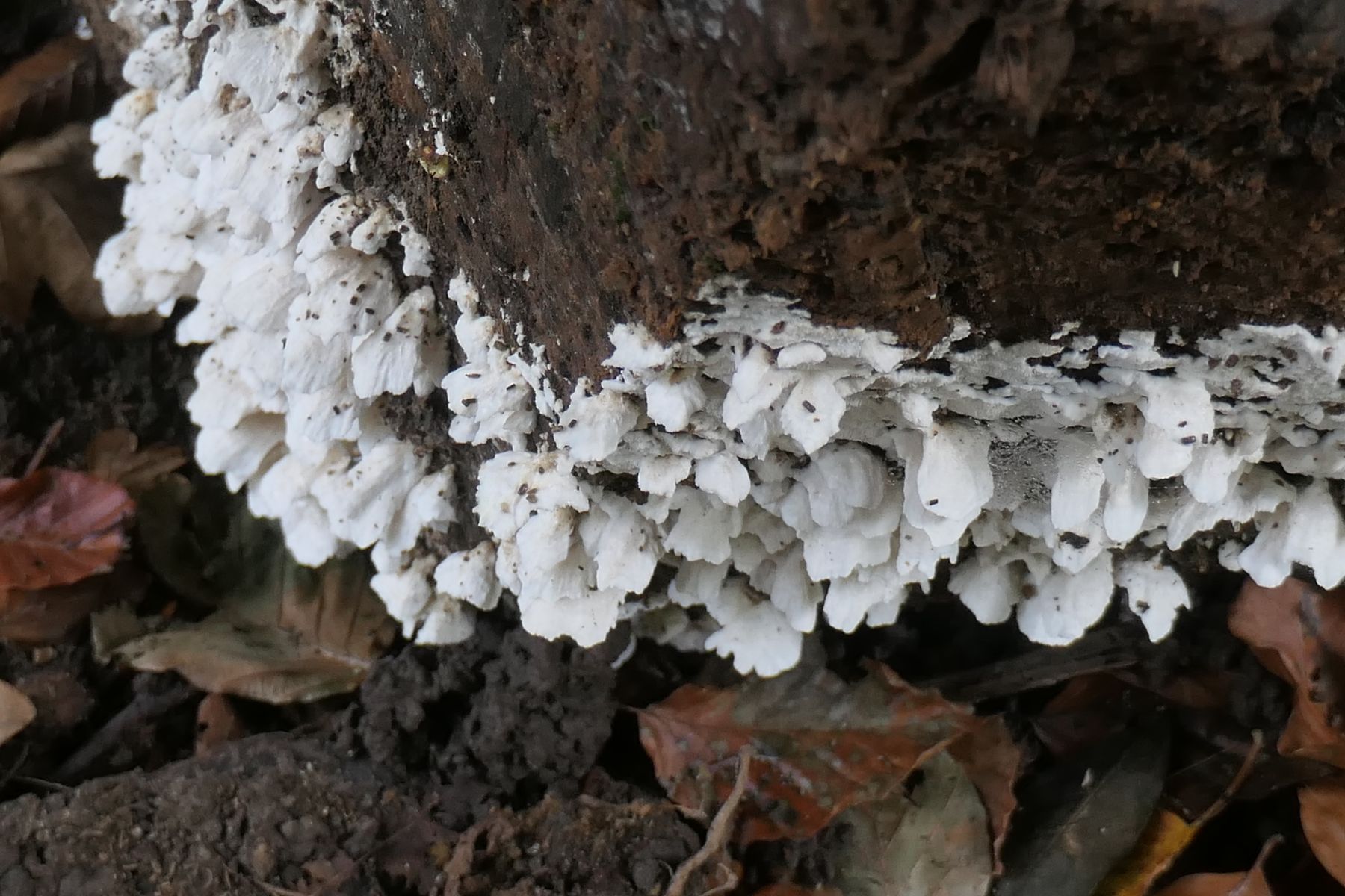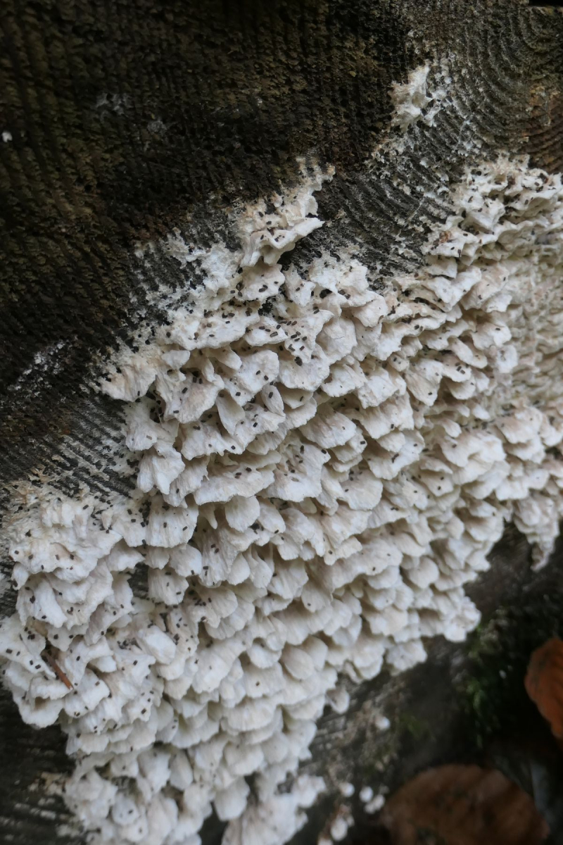 Heute 22.10. auf einer erfolgreichen Totentrompeten Tour bei CH-Safnern BE fielen an der einen Schnittstelle eines gefällten, mächtigen Fichten Stammes diese 'rasig' wachsenden Baumpilzchen mit Poren auf;
