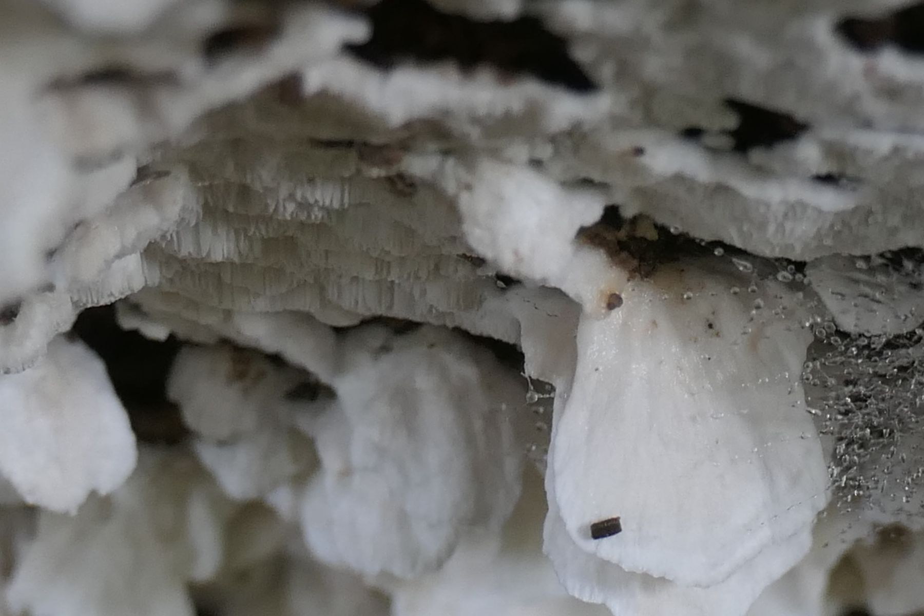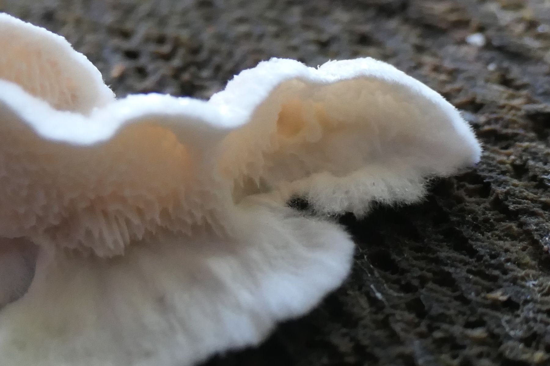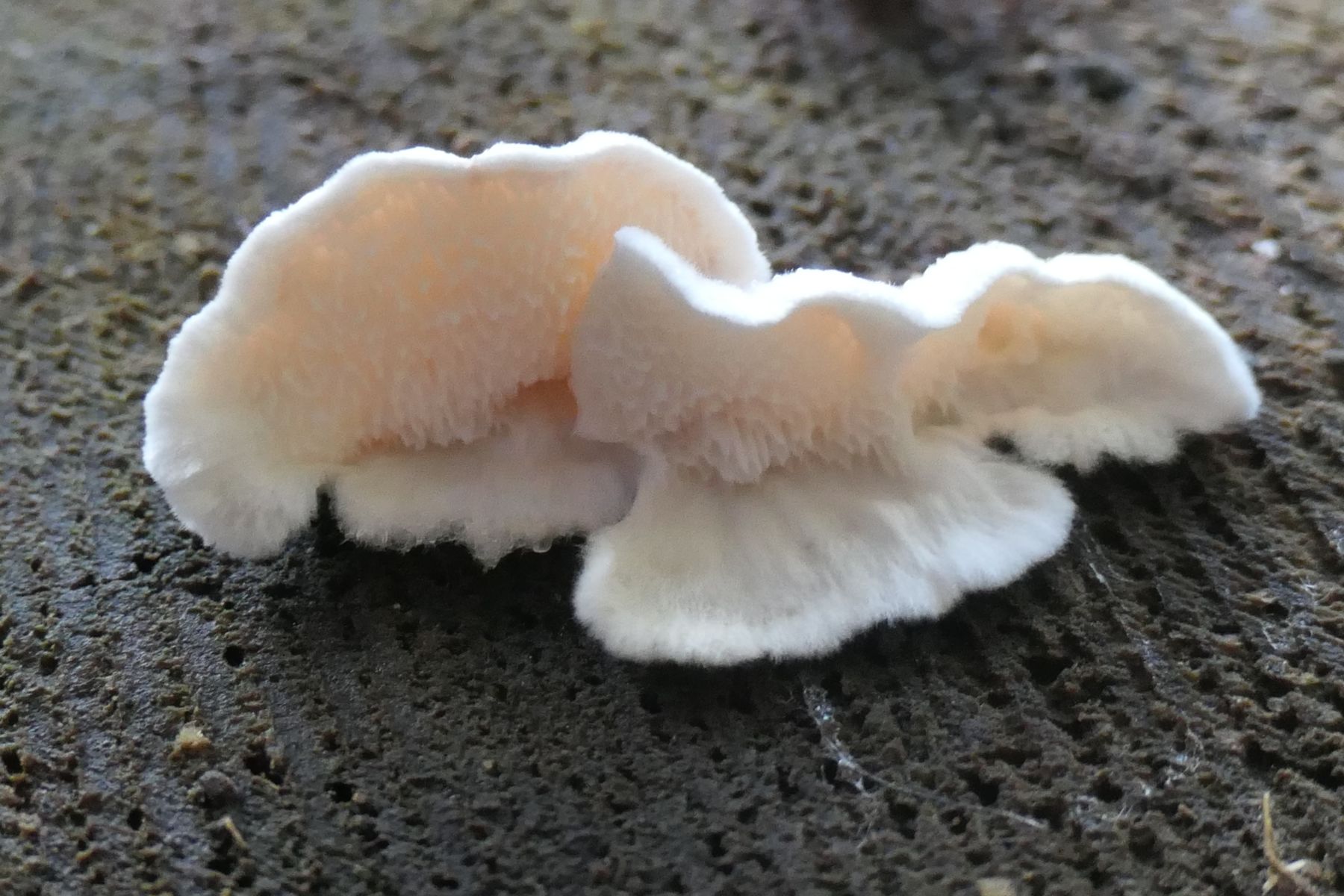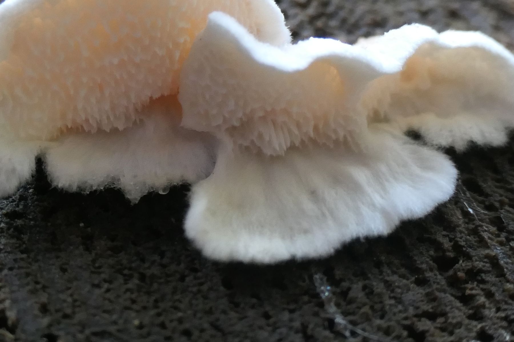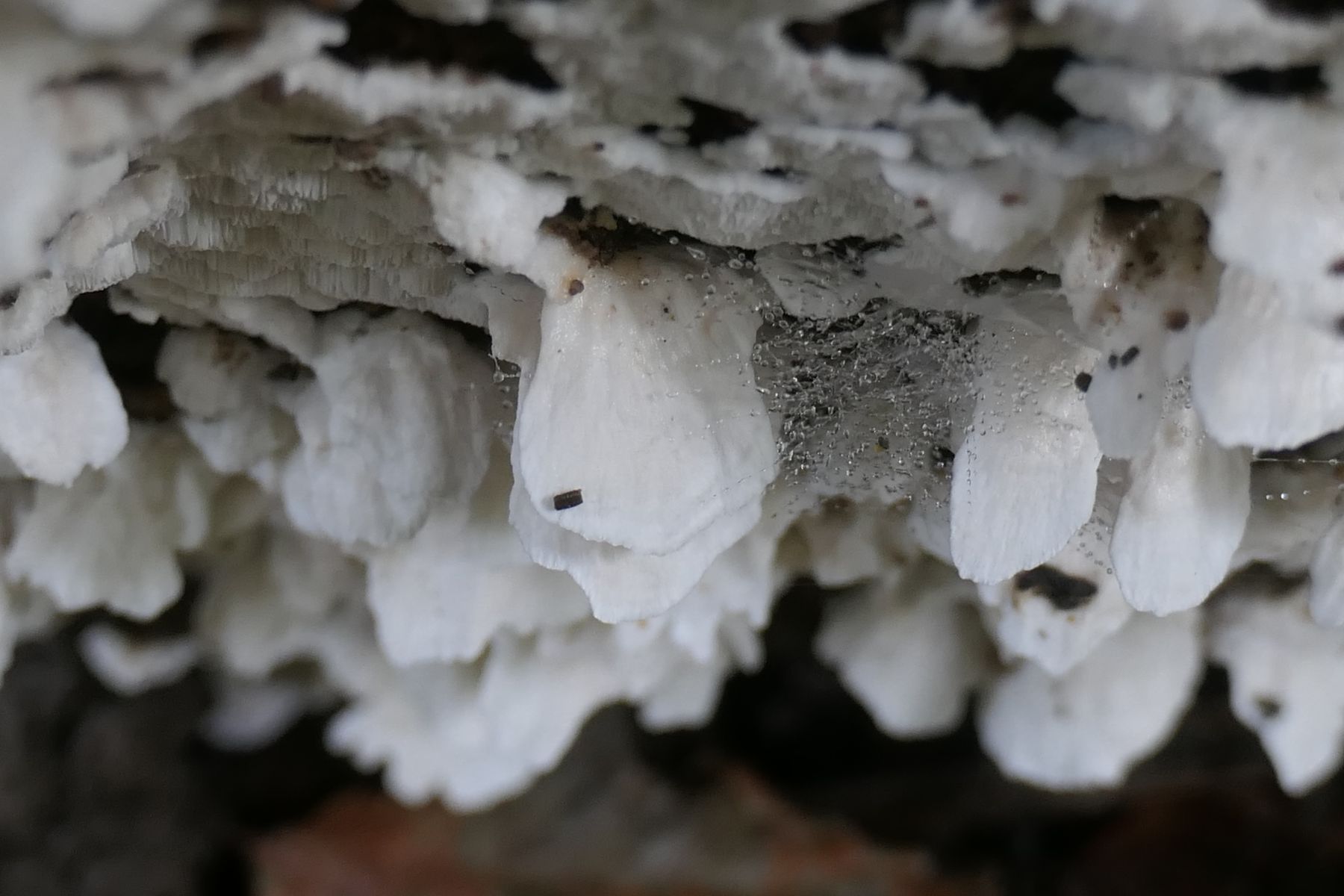 Heute 22.10. auf einer erfolgreichen Totentrompeten Tour bei CH-Safnern BE fielen an der einen Schnittstelle eines gefällten, mächtigen Fichten Stammes diese 'rasig' wachsenden Baumpilzchen mit Poren auf;