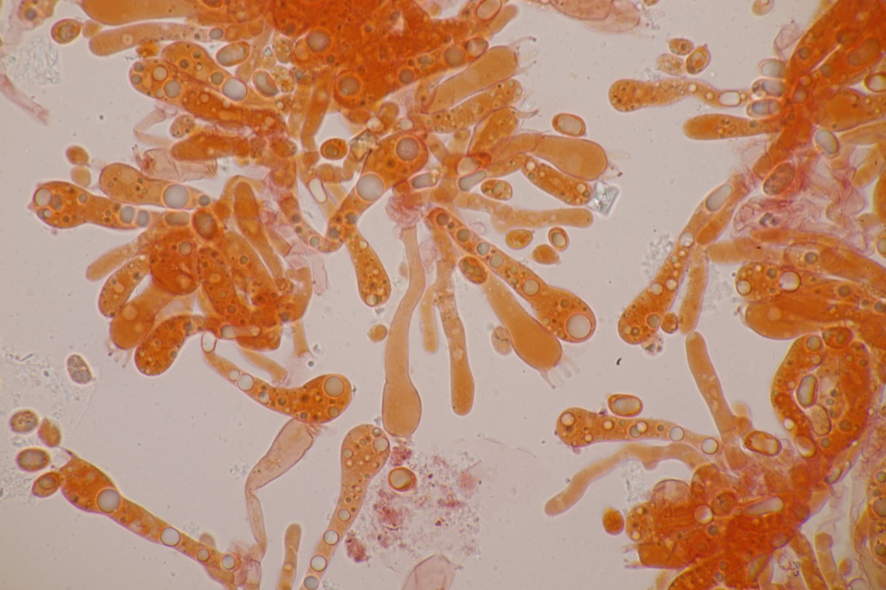 2. Ein Saftling mit glitschigem Hut, wie das Mikroskop auch deutlich zeigt. Sporenmaße 9.0+-0.6 µm x 5.2+-0.5 µm, Q=1.7+-0.1, 8.2-10.5 µm x 4.4-6.1 µm, Q=1.5-1.9, Lamellen aufsteigend angewachsen, Lamellentrama aus langen Zellen. Damit bleibt eigentlich nur Hygrocybe acutoconica, aber dafür wirkten die beiden Fruchtkörper irgendwie zu klein und außerdem sind die Sporen auch nicht groß genug. Hat da jemand eine bessere Idee?