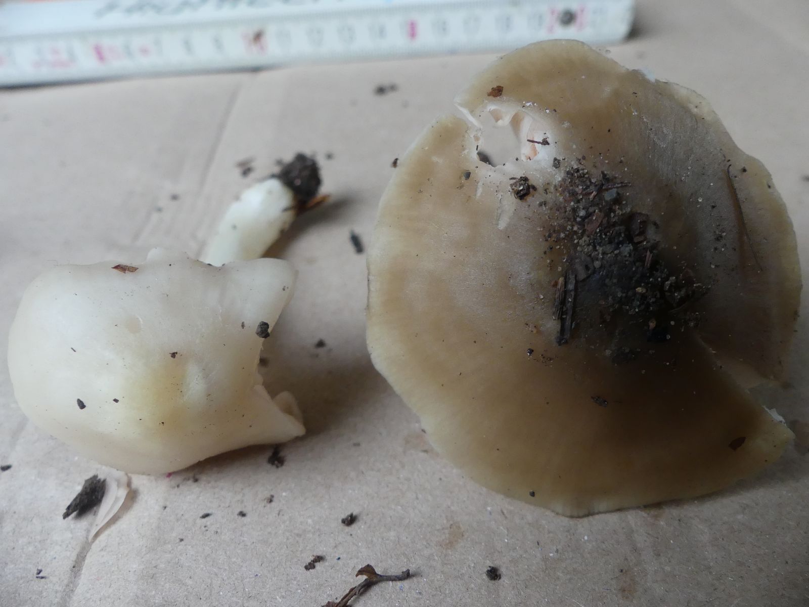 In der Nähe wuchsen auch deutlich dunkelhütigere Entoloma, die mich an E. rhodopolium erinnern. Exemplare mit farblichem "Übergang" konnte ich nicht finden. Entweder weiß mit rahmgelblicher Hutmitte oder deutlich graubrauner Hut, keine fließenden Übergänge.