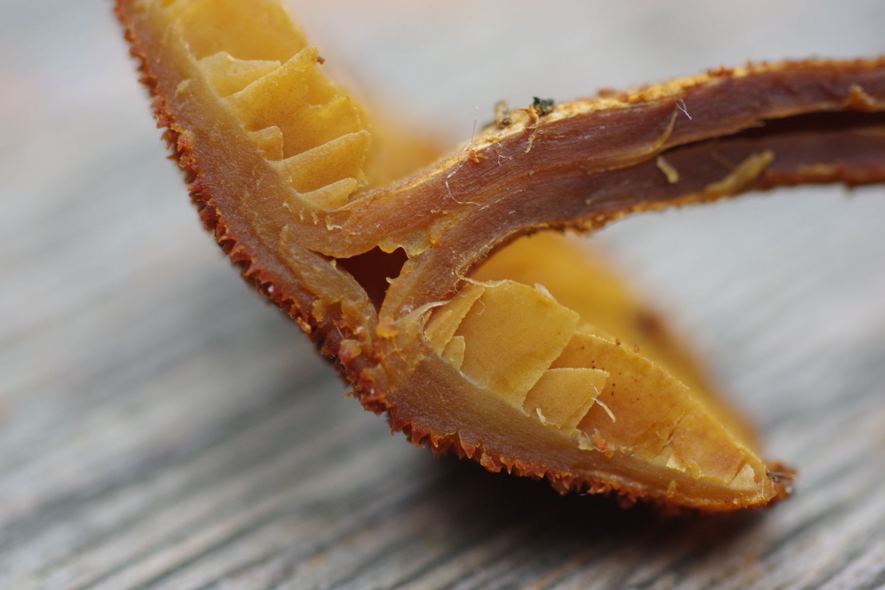Mikrobilder in Wasser, Lamellenschneide steril, deutlich gelblicher als Lamellenseiten