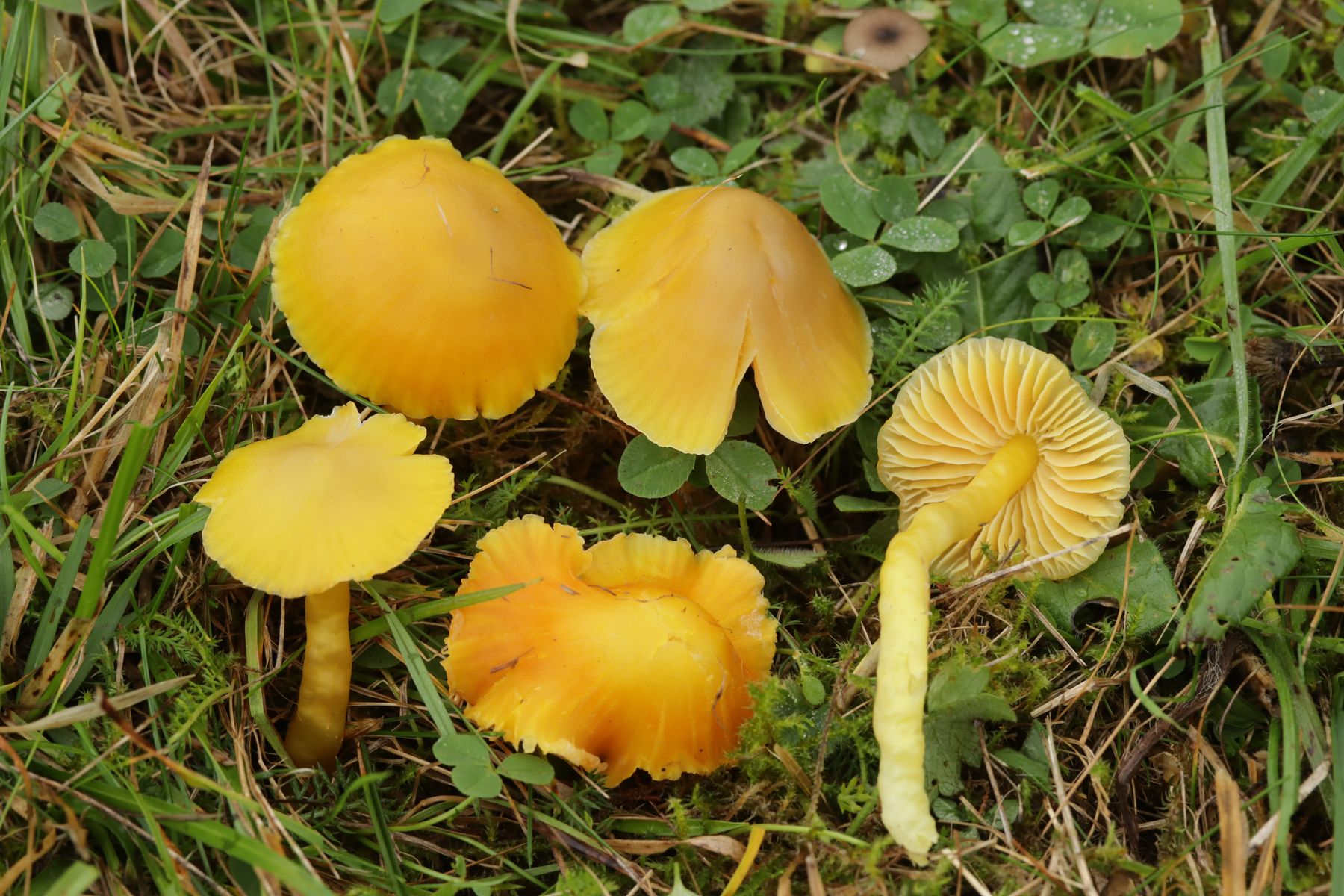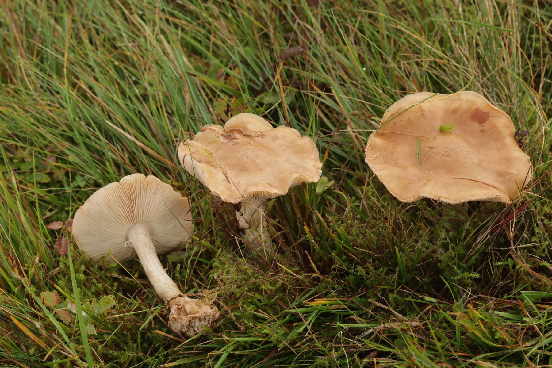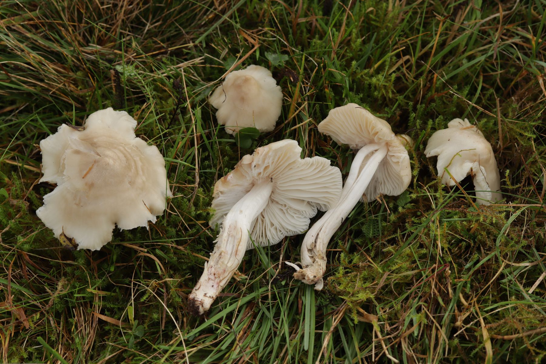 21. Irgendwie wirken mir diese Teile viel zu kräftig und stämmig für Cuphophyllus virgineus und auch der spitz gebuckelte Hut will nicht so recht passen. Kann das Cuphophyllus fornicatus sein?