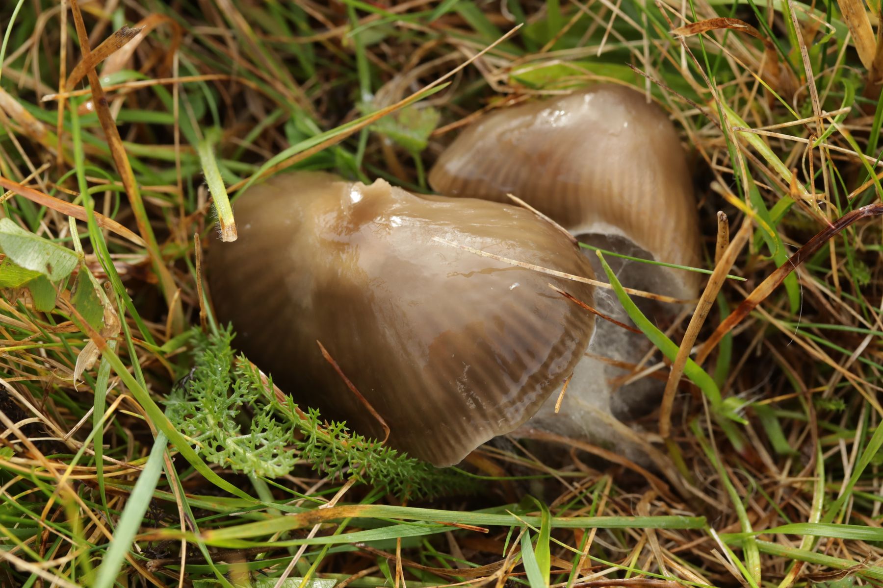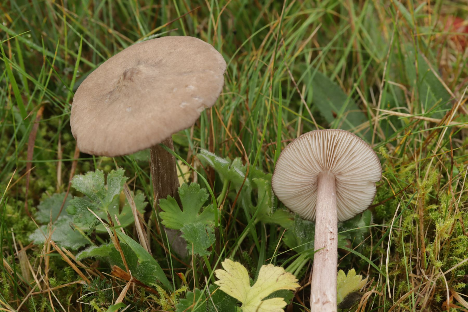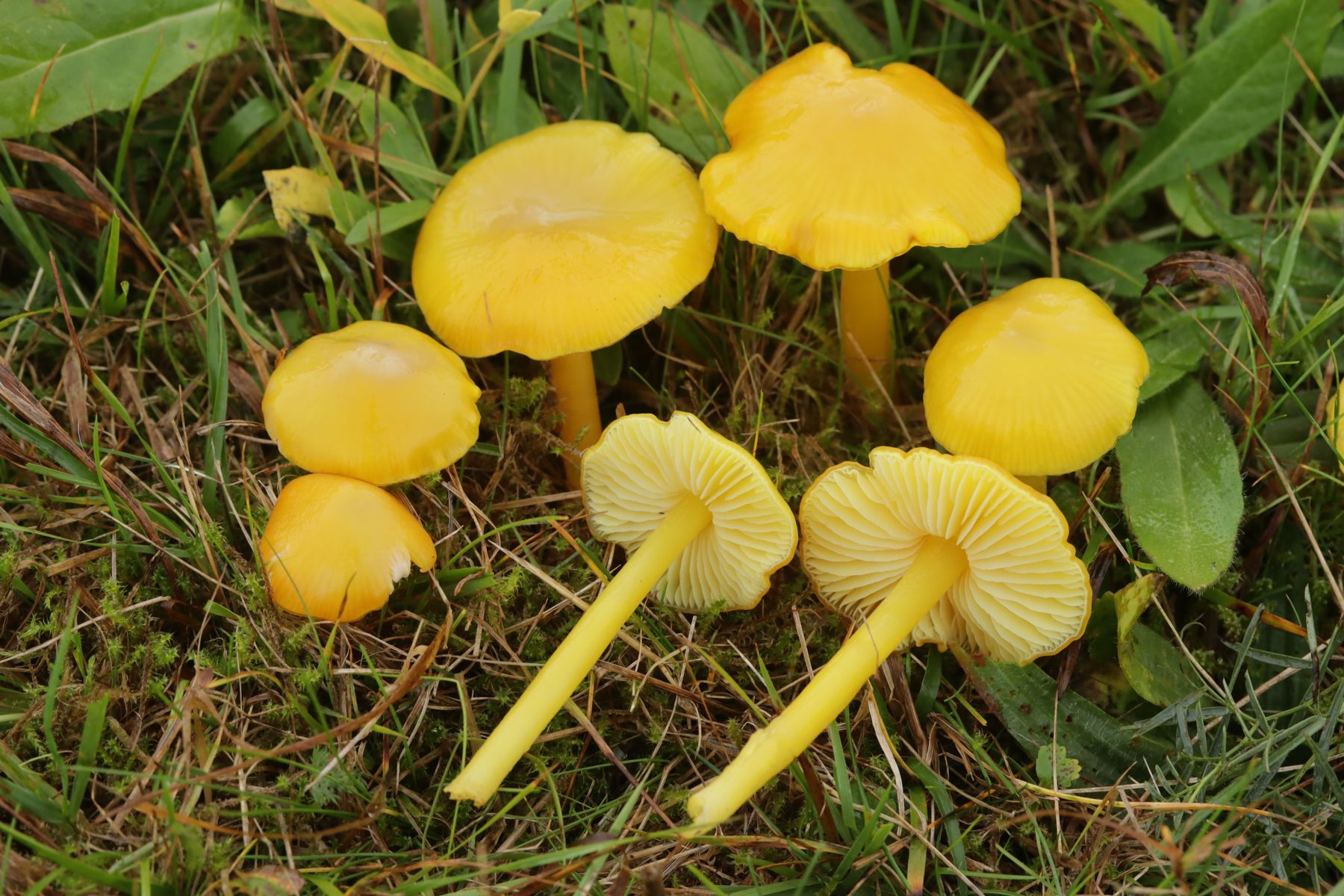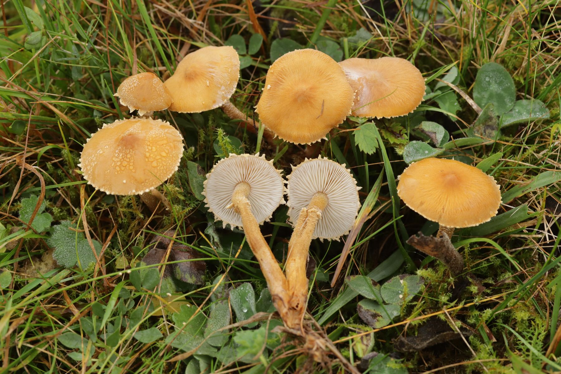 21. Irgendwie wirken mir diese Teile viel zu kräftig und stämmig für Cuphophyllus virgineus und auch der spitz gebuckelte Hut will nicht so recht passen. Kann das Cuphophyllus fornicatus sein?