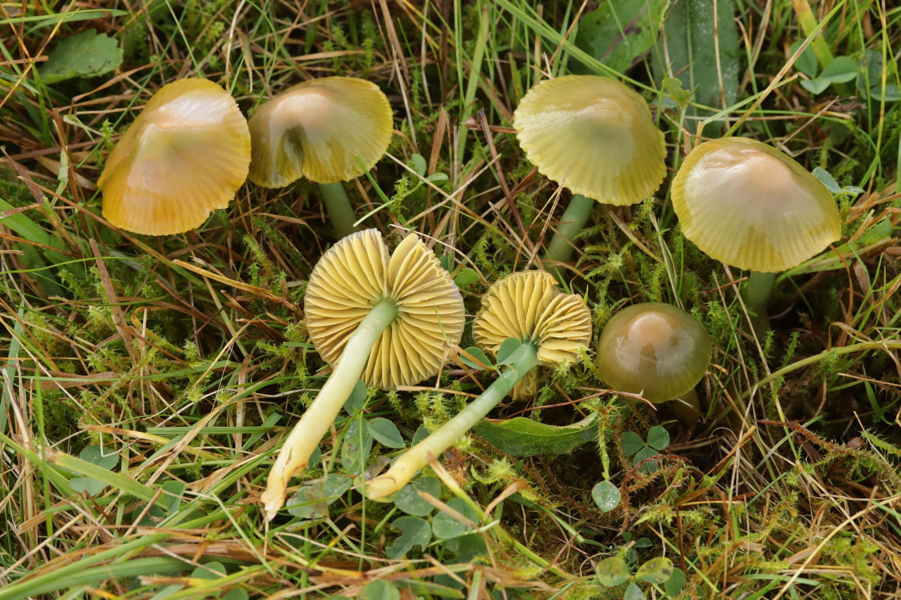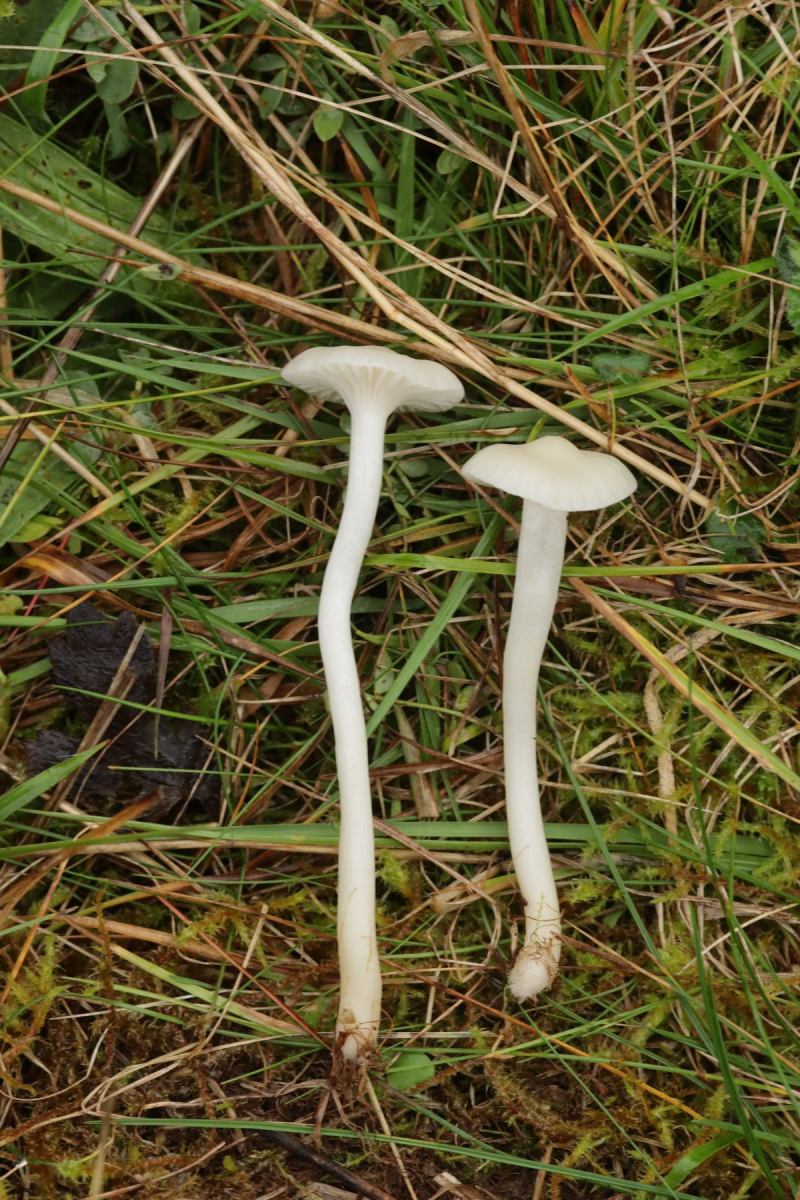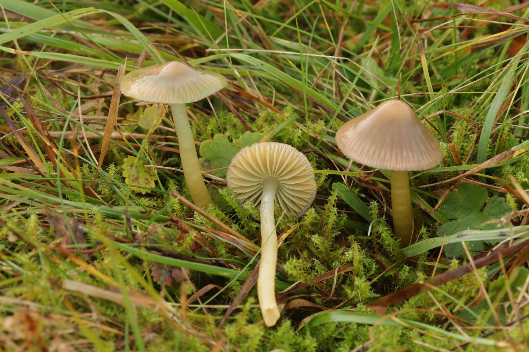 21. Irgendwie wirken mir diese Teile viel zu kräftig und stämmig für Cuphophyllus virgineus und auch der spitz gebuckelte Hut will nicht so recht passen. Kann das Cuphophyllus fornicatus sein?