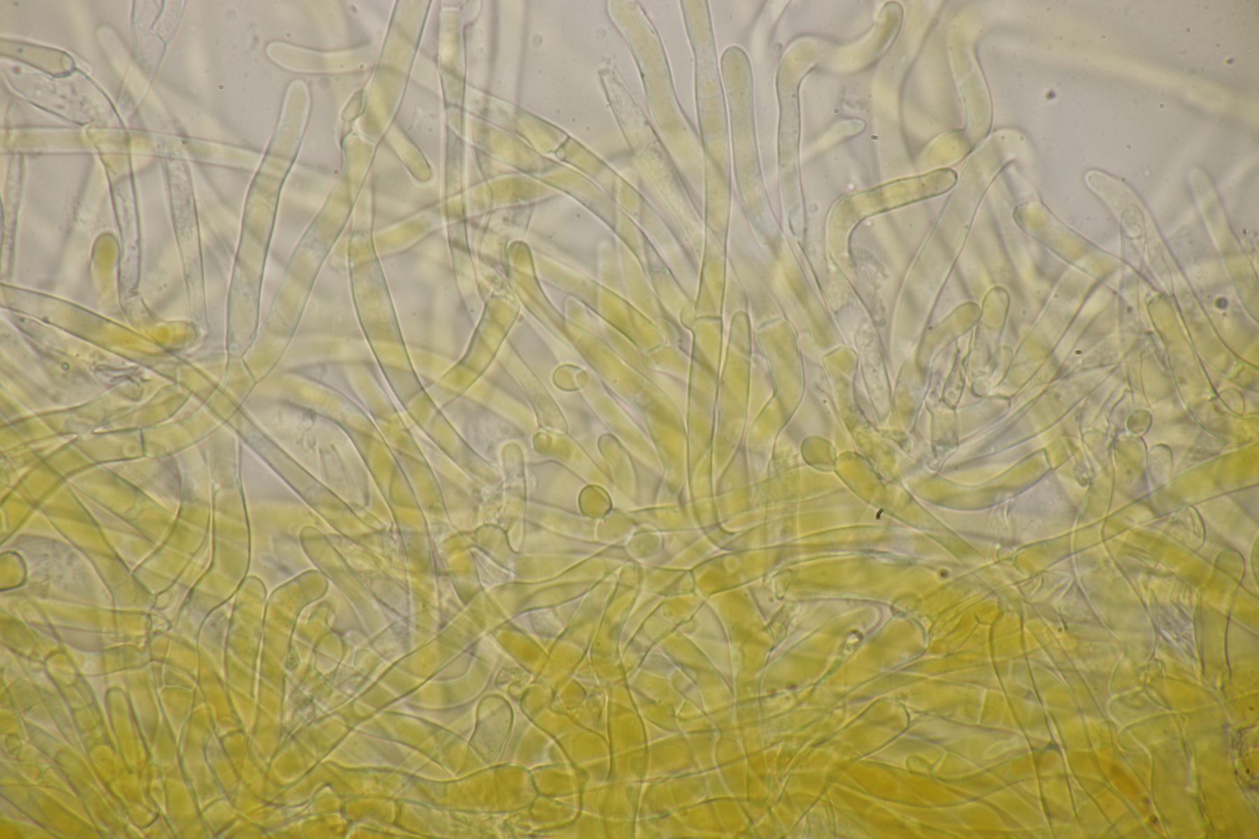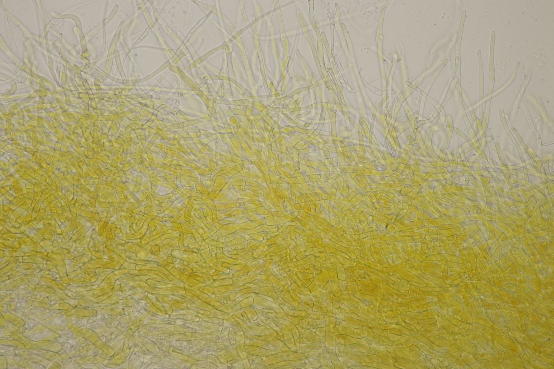 6. Schleimiger Hut, langzellige Lamellentrama, Sporenmaße 7.8+-0.4 µm x 4.7+-0.3 µm, Q=1.6+-0.1, 6.8-8.6 µm x 4.3-5.3 µm, Q=1.4-1.8, Stielspitze z.T. schwach bereift bringt mich zu Hygrocybe chlorophana