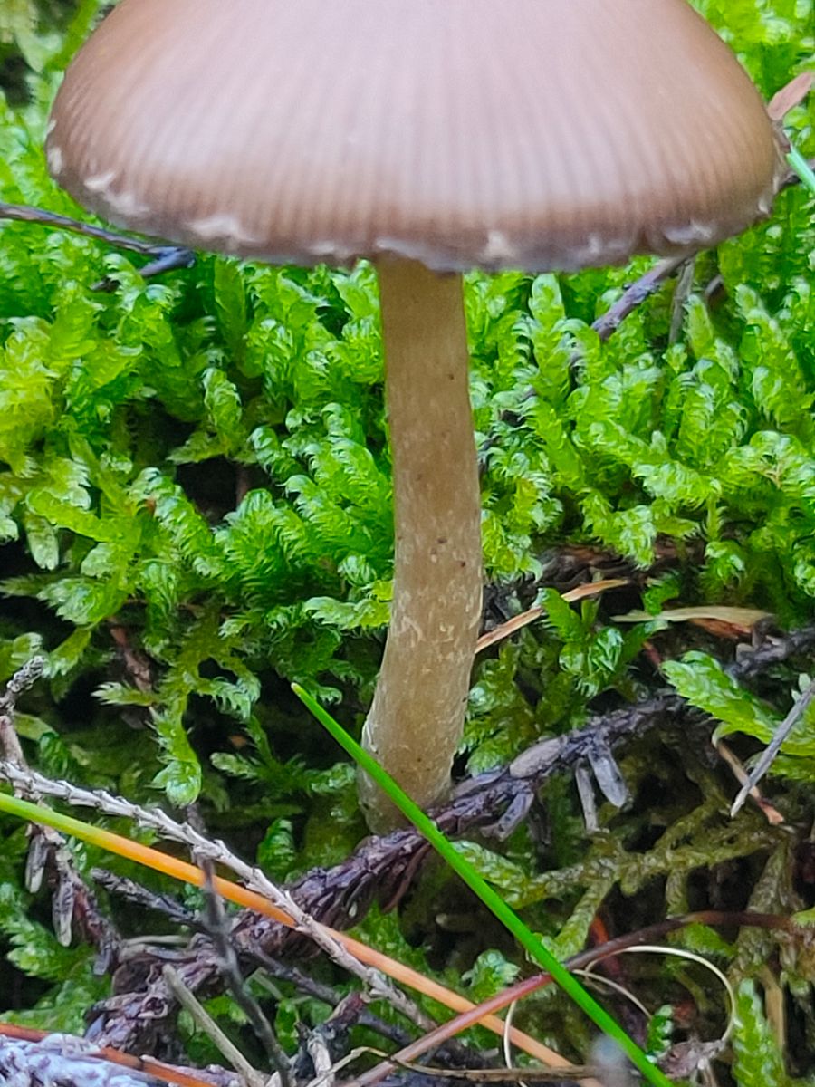 10. Noch ein einzelner Torfmoos zu stehender Entomola mit einer ebenfalls feinsamtigen radialen weißen Hutstruktur. Die Lammellen sind leicht weisslich gecheckt.