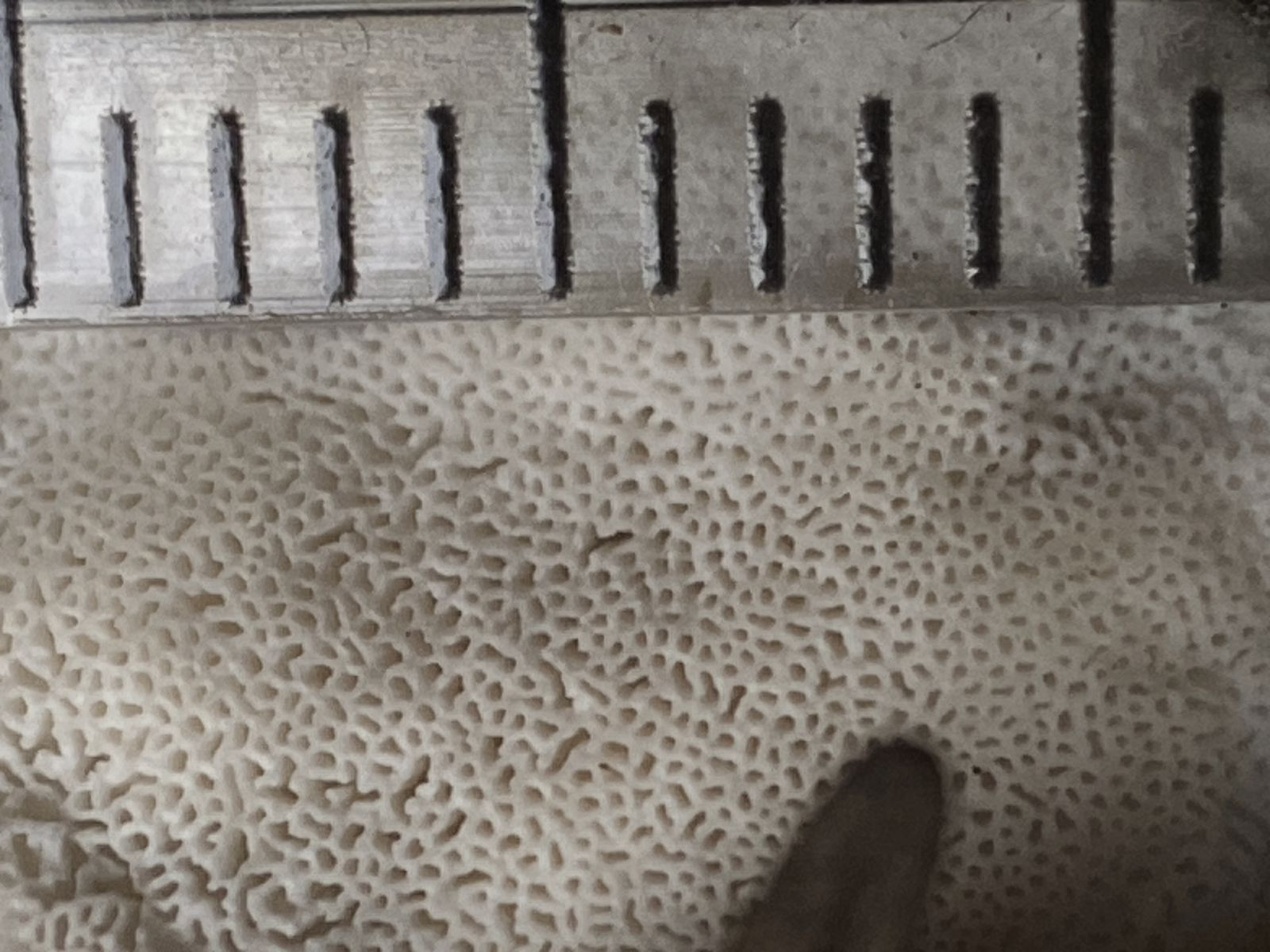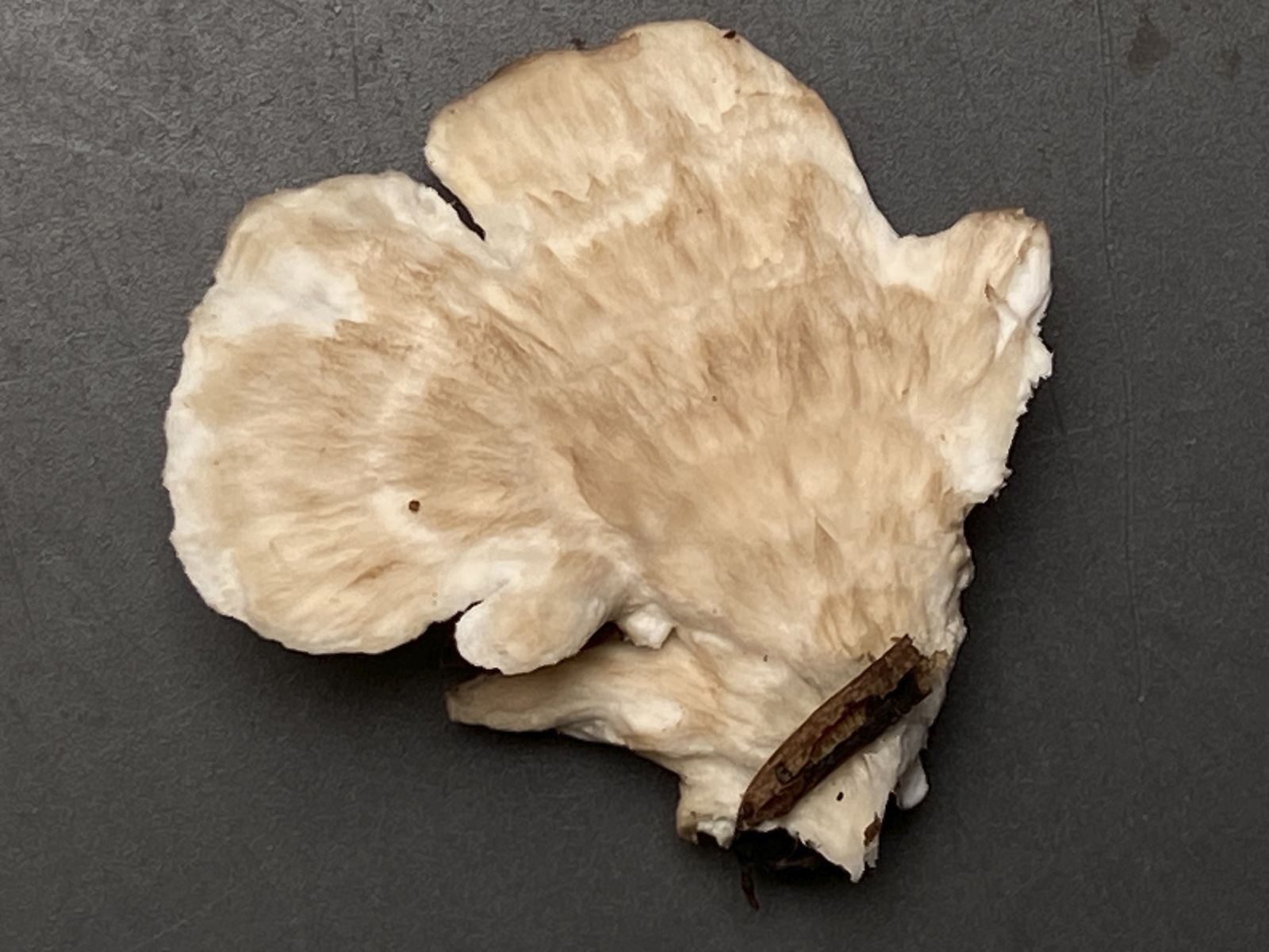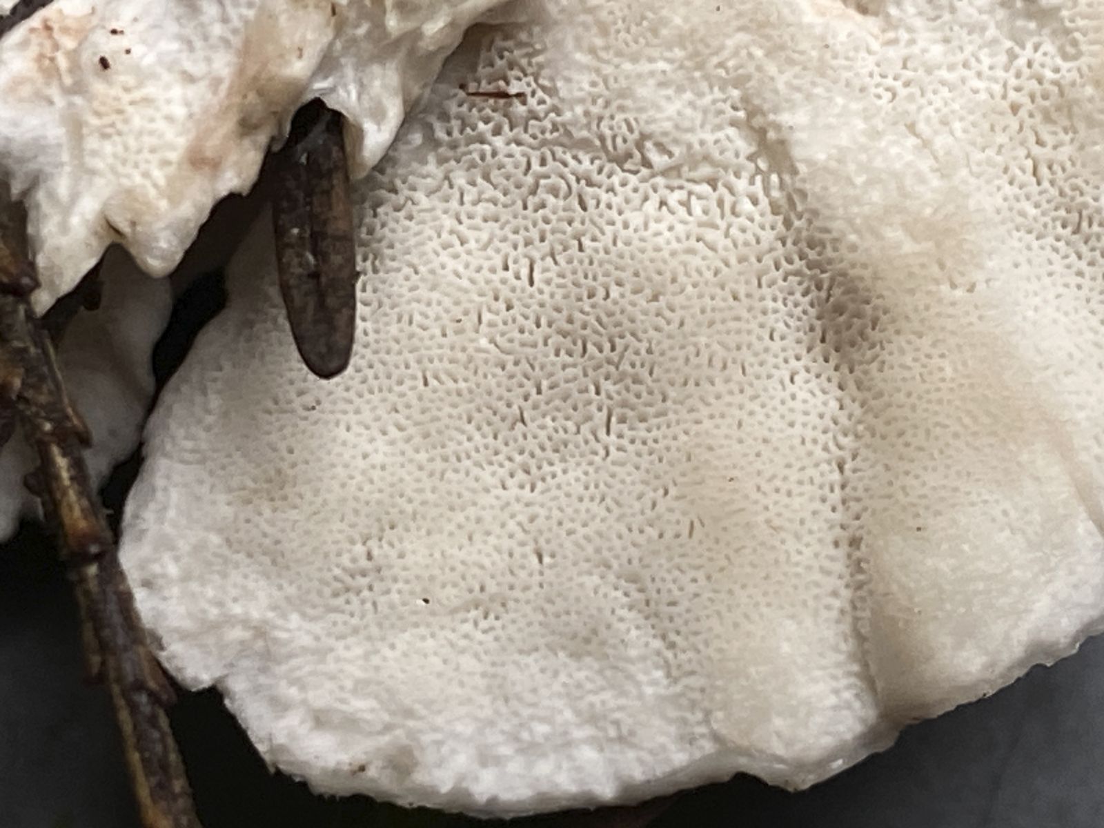 Auf Nadelholz gewachsen; FK bis 7 cm Ø; aus vielen sehr dünnen Lappen bestehend; keine schwarze Linie unter der HH; 4-5 teils unregelmäßige Poren /mm; Geruch neutral.