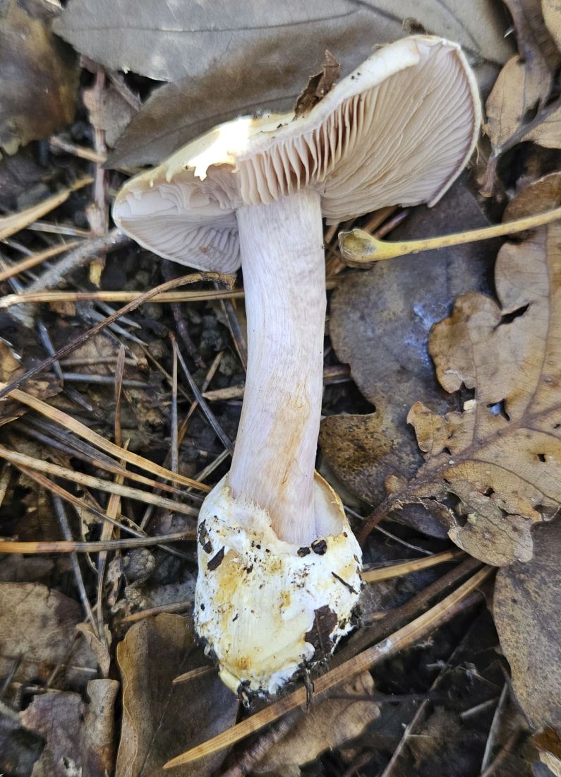 Der Stiel ist weißlich, hat aber einen deutlich violetten Hauch und kontrastiert damit auffällig zum Hut und Knolle (die Bilder geben den lila-Ton etwas zu schwach wieder, in Wirklichkeit wahr der Farbeindruck intensiver). Die Knolle ist realiv schmal, der Knollenrand ist häutig nach oben gebogen, so dass es fast aussieht dass die Knolle in einer Scheide steckt. An der weißen Knollenhaut gibt es gelbliche Verfärbungen.