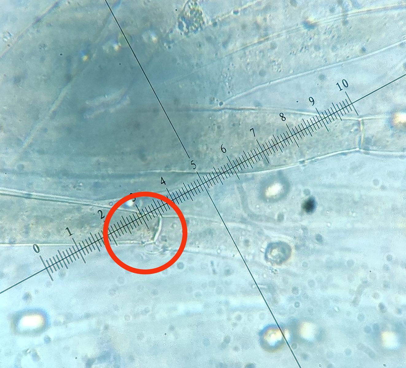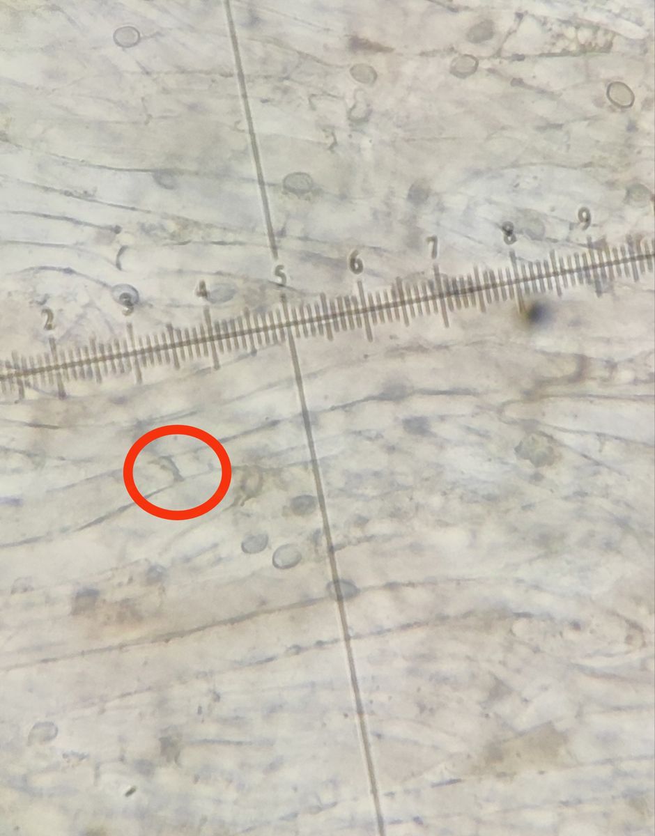 Und dann bin ich in der HDS auf Schnallensuche gegangen. Ich habe mit der Rasierklinge ein Stück Huthaut rausgeschnitten, in einen Wassertropfen auf dem Objektträger, gequetscht und habe das dann auf 400x mikroskopiert. Wenn ich es richtig verstanden habe, wäre das folgende eine Stelle an der ich nach Schnallen suchen müsste oder?