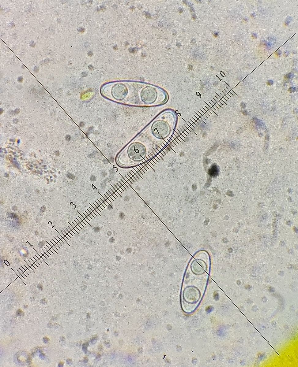 Ich hielt den Fruchtkörper für reif, wollte ihn aber nicht entnehmen und habe daher nur ein Stückchen abgeschnitten um vielleicht Sporen rauszukitzeln. Die sahen so aus: