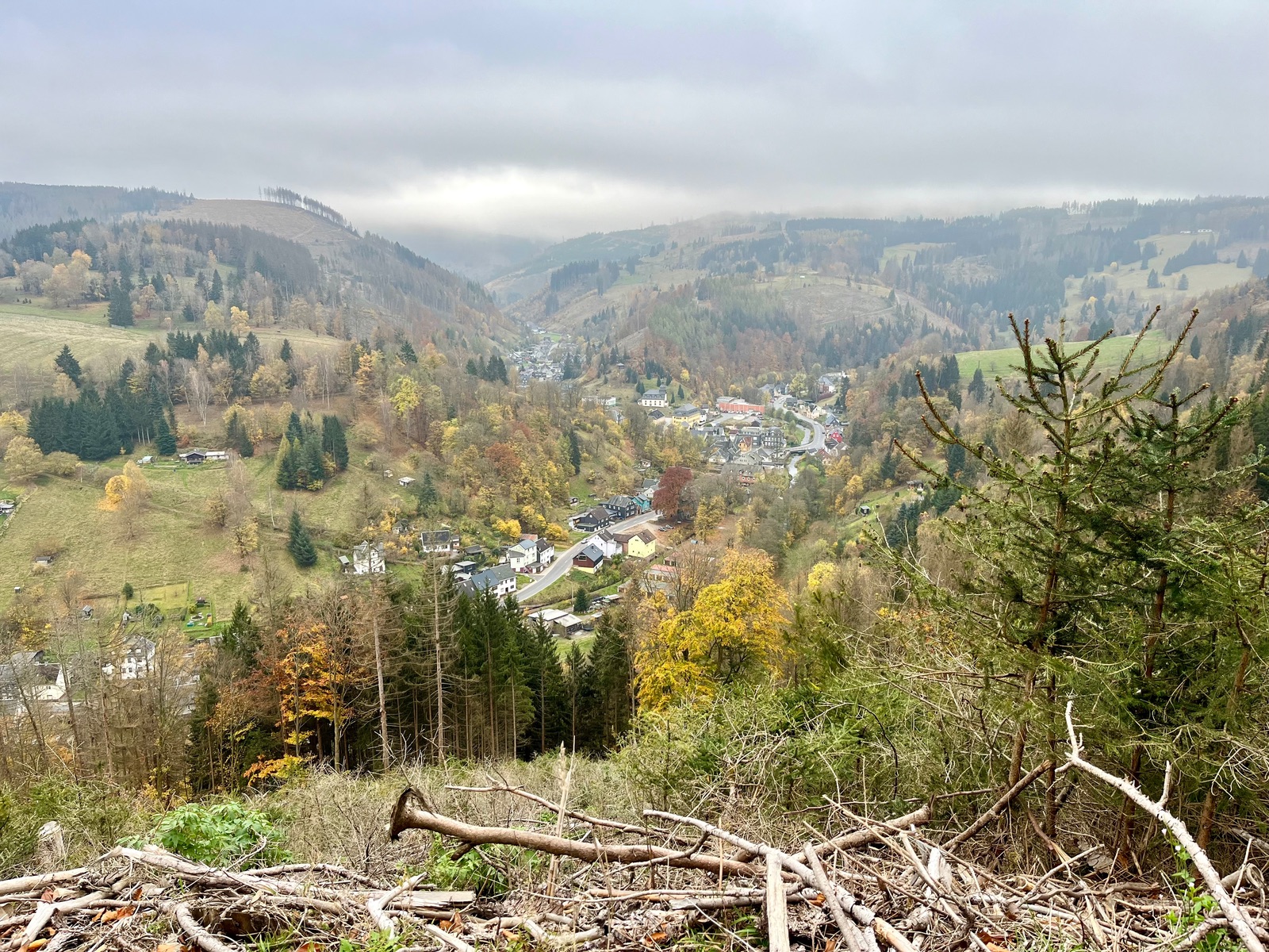 Zunächst ein Blick über den zerrupften Restwald des Schiefergebirges auf den wolkenverhangenen Rennsteig bei Neuhaus. Immerhin sind ohne Bäume auch Fernsichten möglich. So hat das Fichtensterben auch was Gutes.