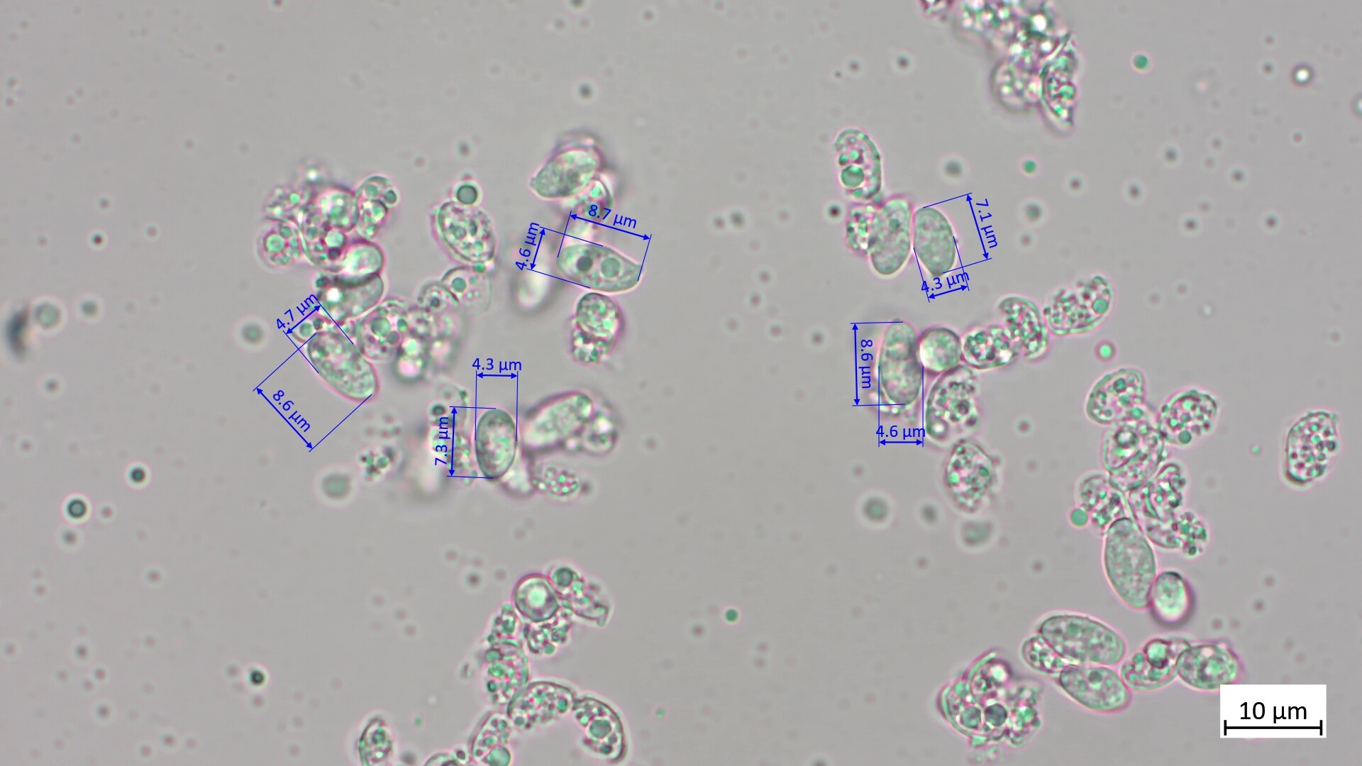Ich habe 46 Sporen gemessen: 8.1 µm (7.1 - 9.2 µm) x 4.5 (3.9 - 4.9 µm), Q = 1.82 (1.65 - 2.07):