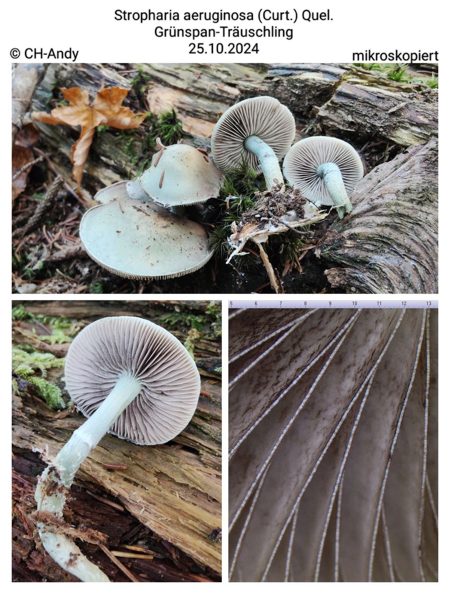 ich finde Str. aeruginea deutlich häufiger als Str. caerulea. In Pilze-Deutschland haben wir Str. aeruginea bei etwas über 6000 Nachweisen und Str. caerula bei etwas über 4000. Im vorletzten Bild sieht man die weißen Lamellenschneiden sehr gut, so dass hier vielleicht beide Arten aufgesammelt wurden.