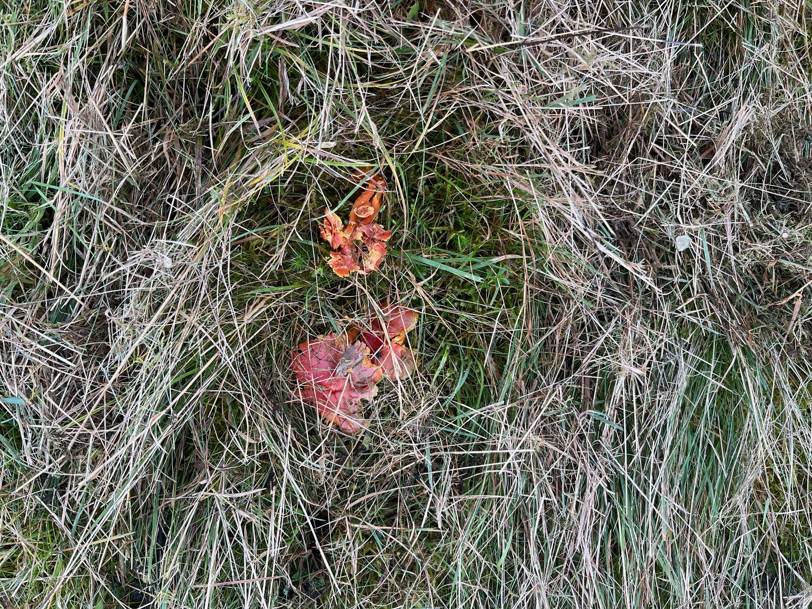 Diese Wiese hatte ich erst im letzten Jahr entdeckt, jeweils mehr als hundert Hygrocybe punicea und Hygrocybe splendidissima wucherten in dem kleinen Tal wild durcheinander. So ein Massenaufkommen dieser seltenen geschützten Arten hatte ich noch nie zuvor gesehen. Hier hatte ich letztes Jahr einen Beitrag dazu verfasst: "Meine" neue Saftlingswiese