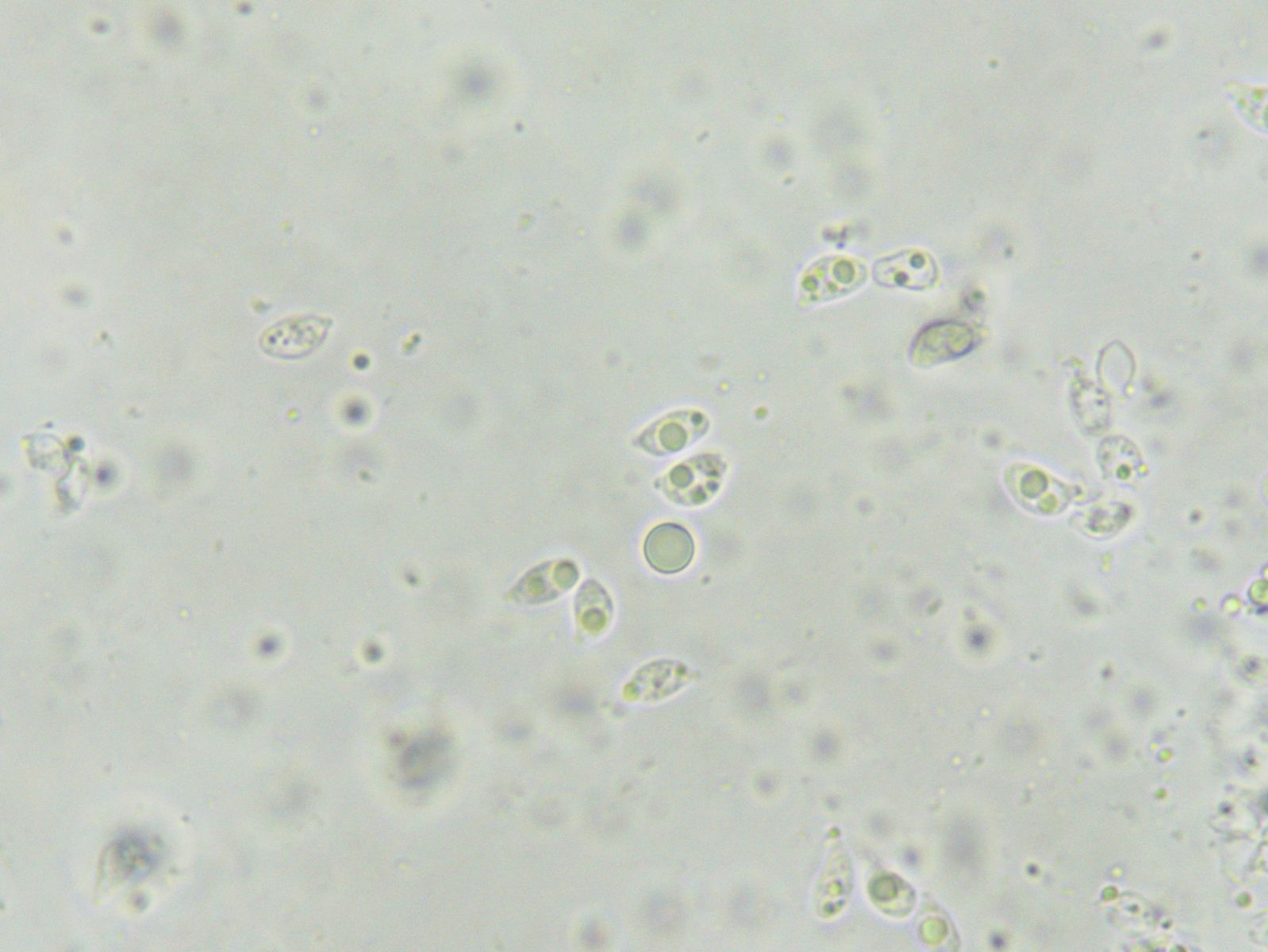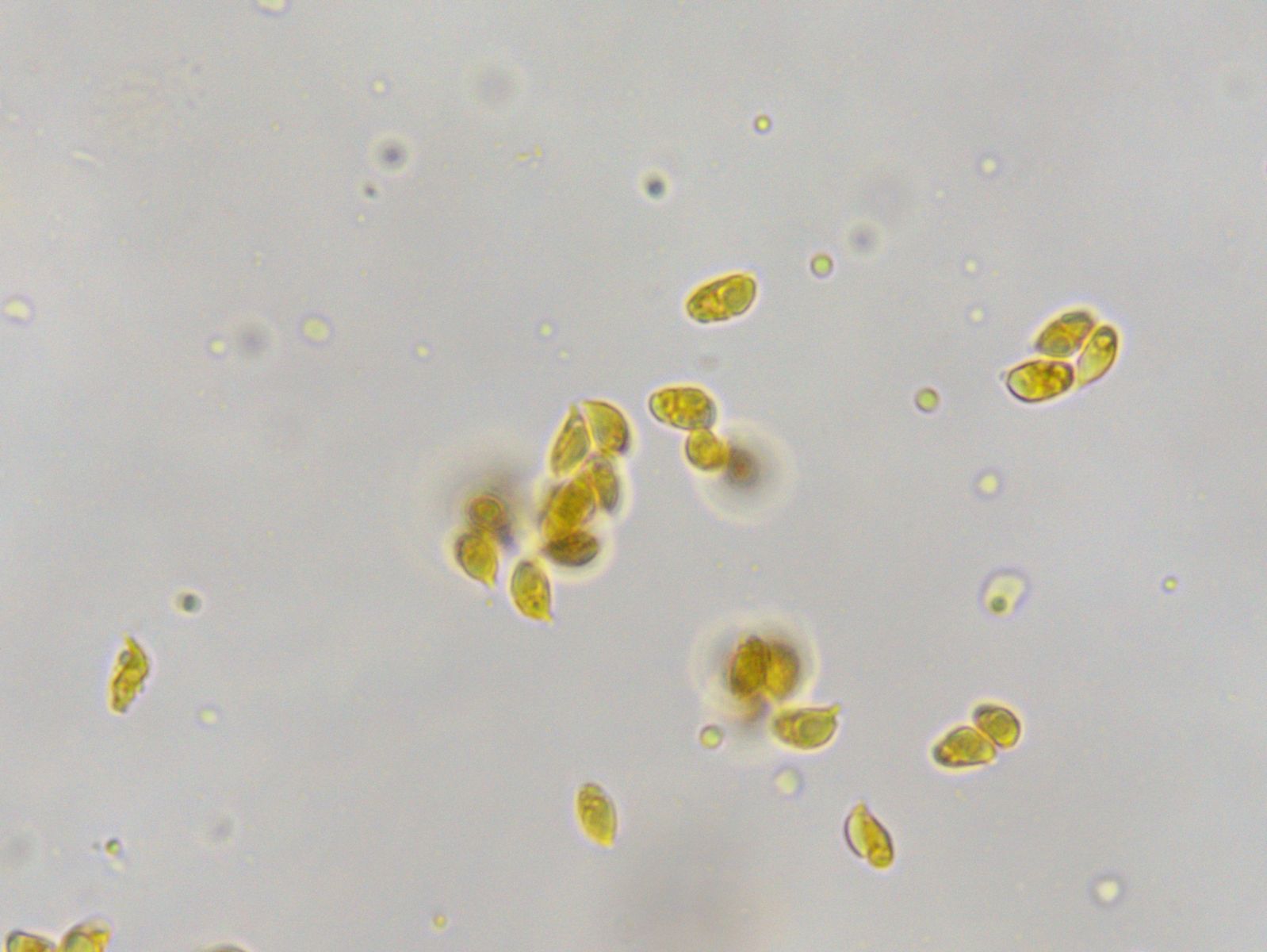 Oehrling, du wirst lachen, das habe ich sogar gemacht. Dass das Sporenpulver weiß ist, schrieb ich ja, und ich habe Melzer draufgeworfen. Aber du hattest mich neulich mit deiner Bemerkung, dass es bei Dextrinoidität nur "hopp oder topp" gäbe, so aus der Bahn geworfen, dass ich nicht wusste, was ich mit dem Ergebnis anfangen soll, denn das hätte ich (wie bei der Dextrinoidität-Einstufung bei Ludwig bei den Fälblingen) wieder bei 1-2 eingestuft, habe aber keine Ahnung, wie das bei Gminder/Karasch oder bei FoTE einsortiert wird. Die Sporen in Melzer sehen jedenfalls so aus: