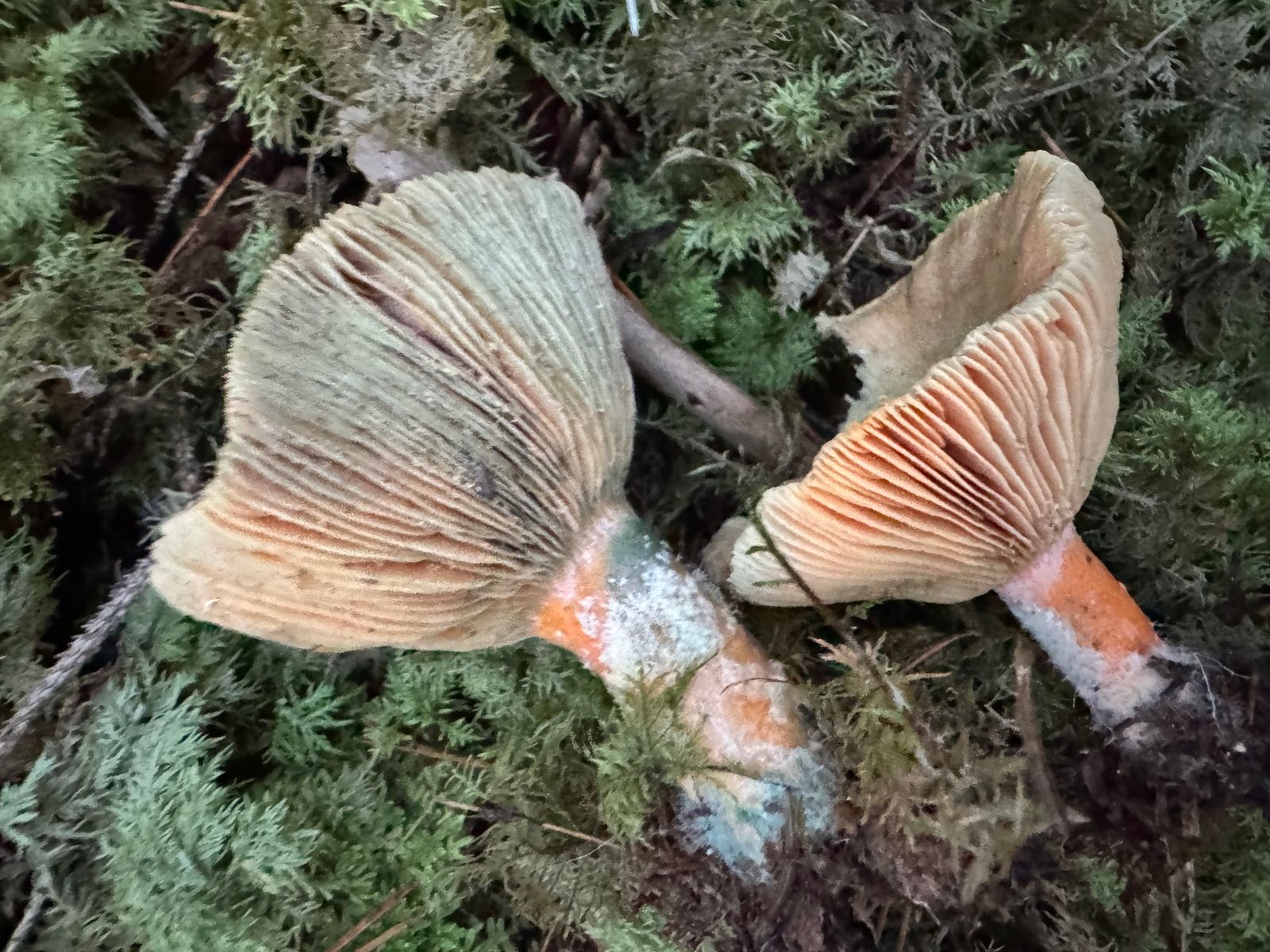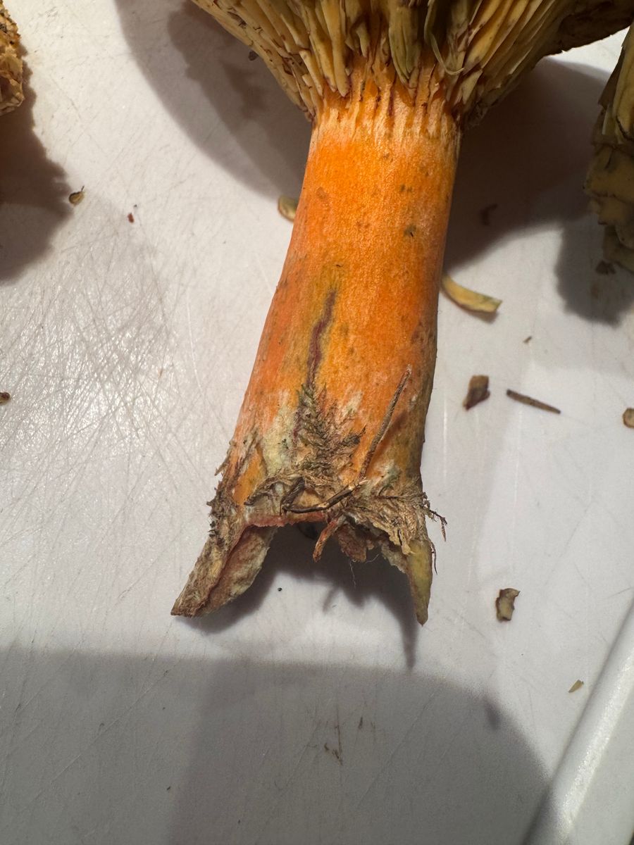 Die Reizker waren aber diesesmal im feuchten Moos und kamen teilweise gerade so durch. Viele habe ich stehen lassen, vorallem weil sie einen weißen Saum am Stiel hatten. Ich frage mich ob das nun schädlicher Schimmel ist oder vielleicht etwas wie an Austernpilzen was ja eben nicht schlimm ist. Habe sie mal trotzdem stehen lassen und nur mitgenommen wo das nicht der Fall war bzw nur so wie es mir auch bei den Pilzen zuvor niemals aufgefallen war, hier mal die Fotos von den krassen Fällen: (nicht denken dass ich den jemals noch essen wollen würde, es geht prinzipell und die Eigenart dieses weißen Flaums.