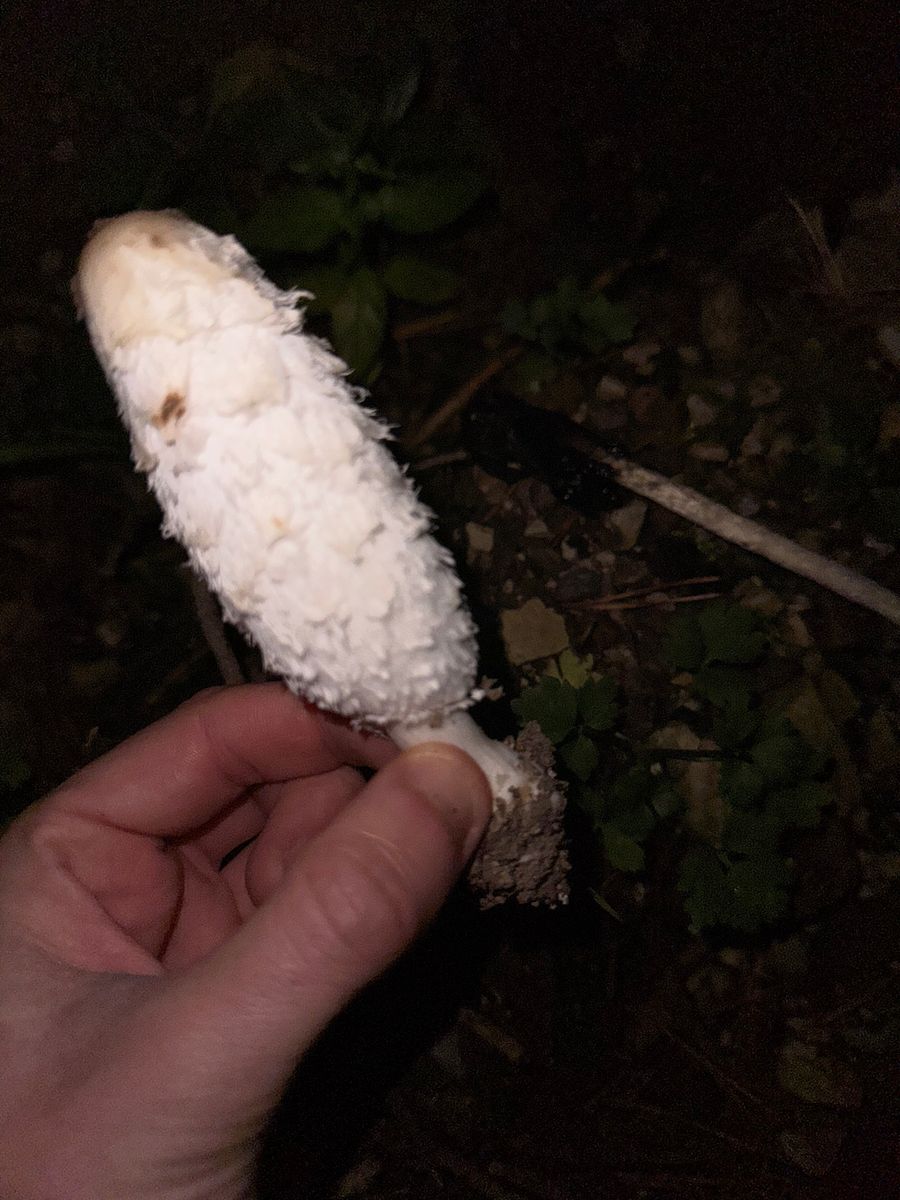 Und hier mein erster Schopfttintling. Da gibts ja in der Größe keine wirklichen Verwechslungspartner und den hab ich jetzt so viele Male in Videos gesehen, daneben ja auch noch der zerlaufene Tintling und der hohle Stiel (ist bei 123pilze unter Stiel gar nicht aufgelistet auf einem Schnittbild aber auch zu erkennen), dass ich den sicher bestimmen kann, nur heißt es da ja oft nur gaanz jung verzehren, aber wäre dieser hier oder? Noch ganz weiß ohne Tinte. Perfekt oder? (das rote kommt vom Reizker)