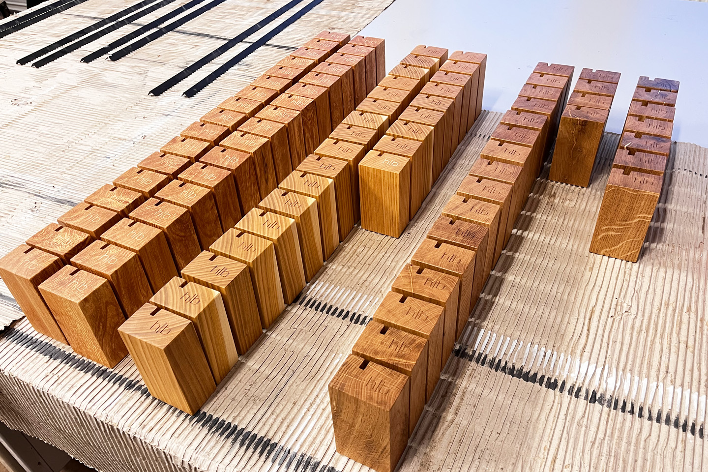 Bisher hatte ich immer zwei bis vier verschiedene Holzarten genutzt, je nach Verfügbarkeit und Trocknungszustand. In diesem Jahr kann ich die Sockel aus Vogelkirsche, Wildbirne und Eiche herstellen, je nach Wahl. Das Holz wird übrigens mit einem hochwertigen Hartwachsöl (farblos) behandelt, die Holzstruktur bzw. Maserung bleibt also sichtbar.