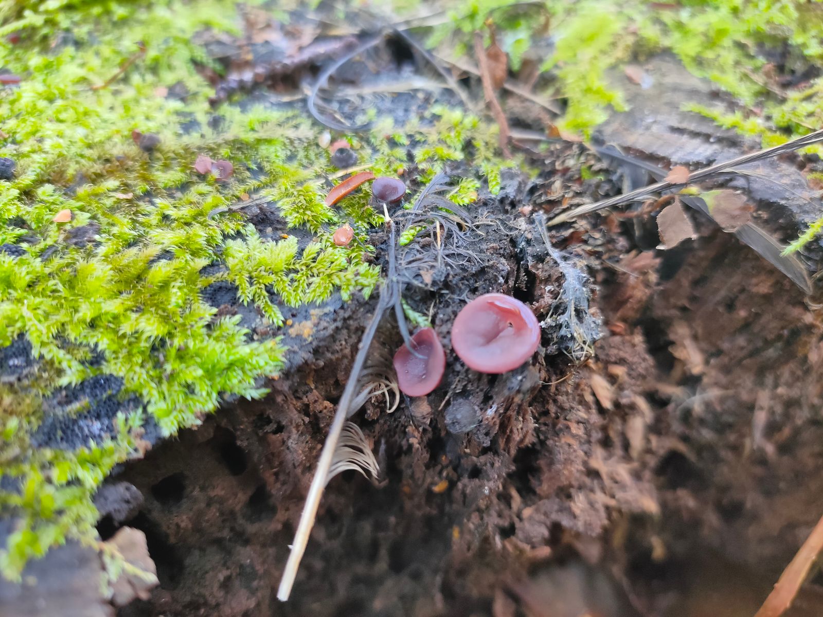 2. Ascocoryne: Dieser war auf einem vermoostem Pappelstumpf in der Gesellschaft von überständigen Stockschwämmchen zu finden. Die FK sind etwas kleiner als 1 cm im Durchmesser. Das Fleisch zeigt den selben violette Ton. So richtig fündig werde ich leider nicht.