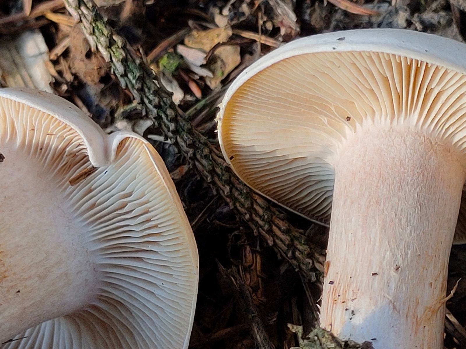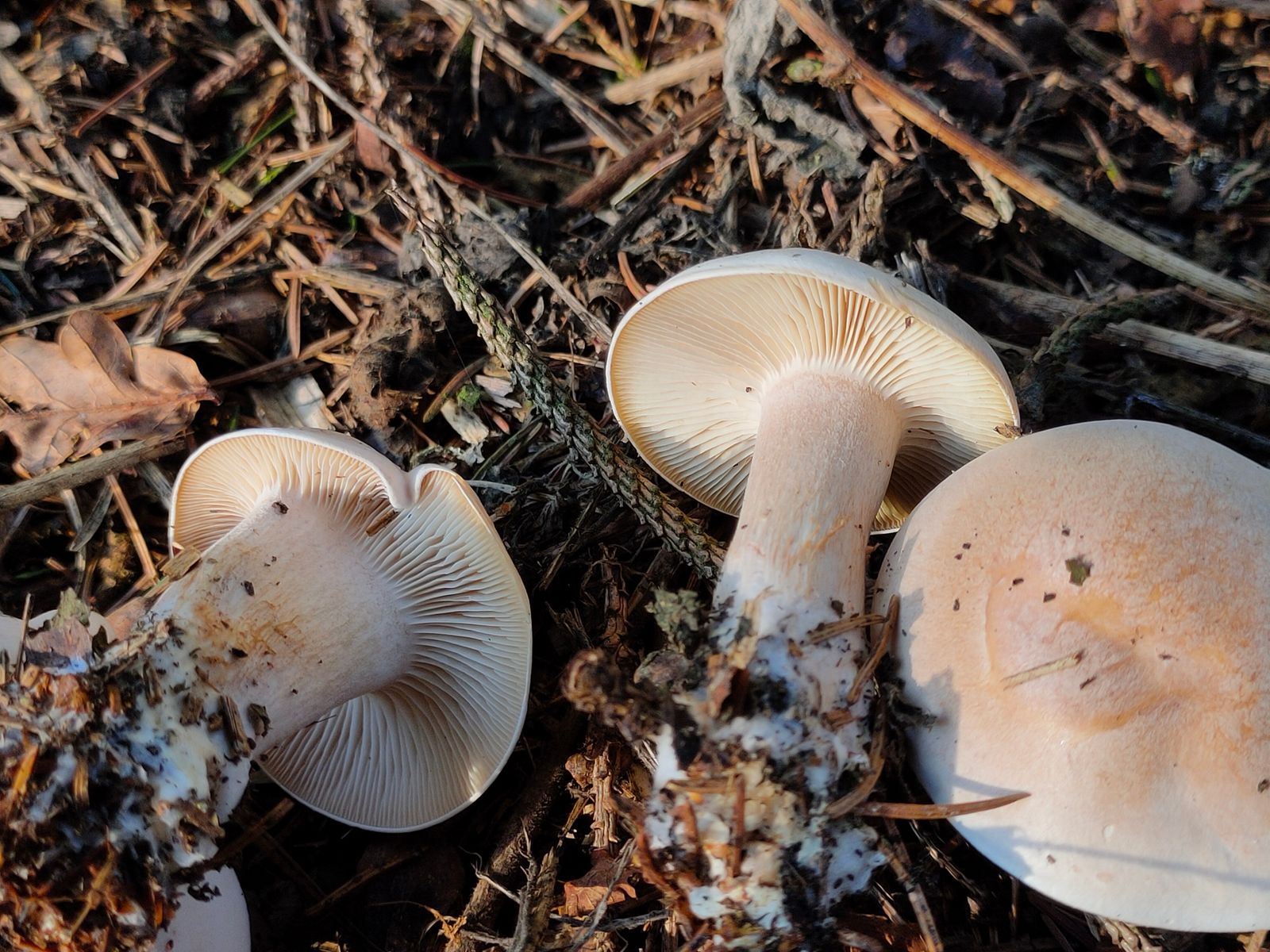 Ich gehe mittlerweile eher von einer Clitocybe/Tichterling aus. Die Lamellen sind recht dicht stehend und dünn und sprechen doch