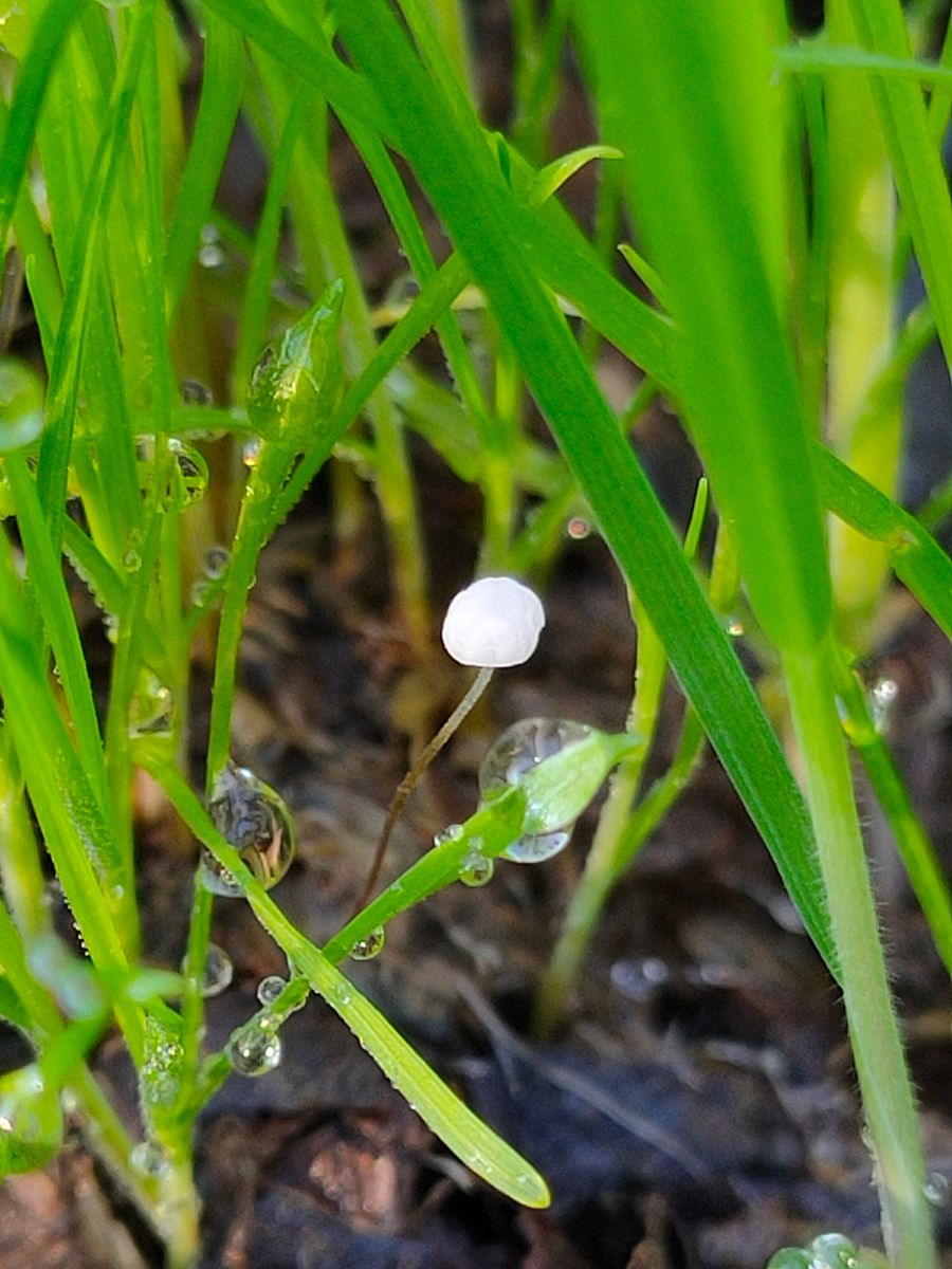 4.Hemmycena Rhizomarasmius: Auf der Wiese zwischen dem Gas sehe ich zufällig einen sehr kleinen FK (ca 2-3mm). Nach der Recherche sollte dieser einer der Scheinhelmlinge sein.