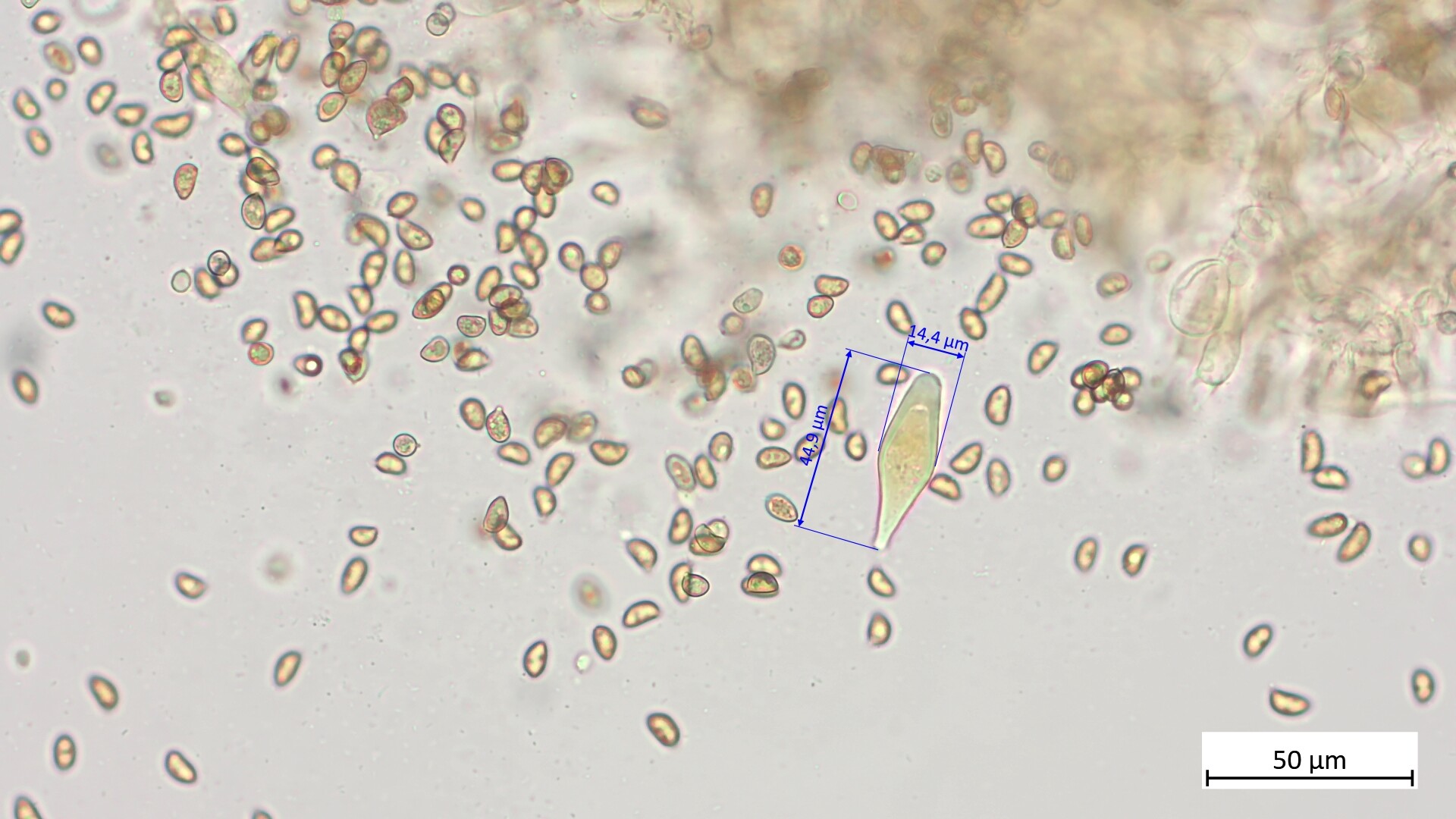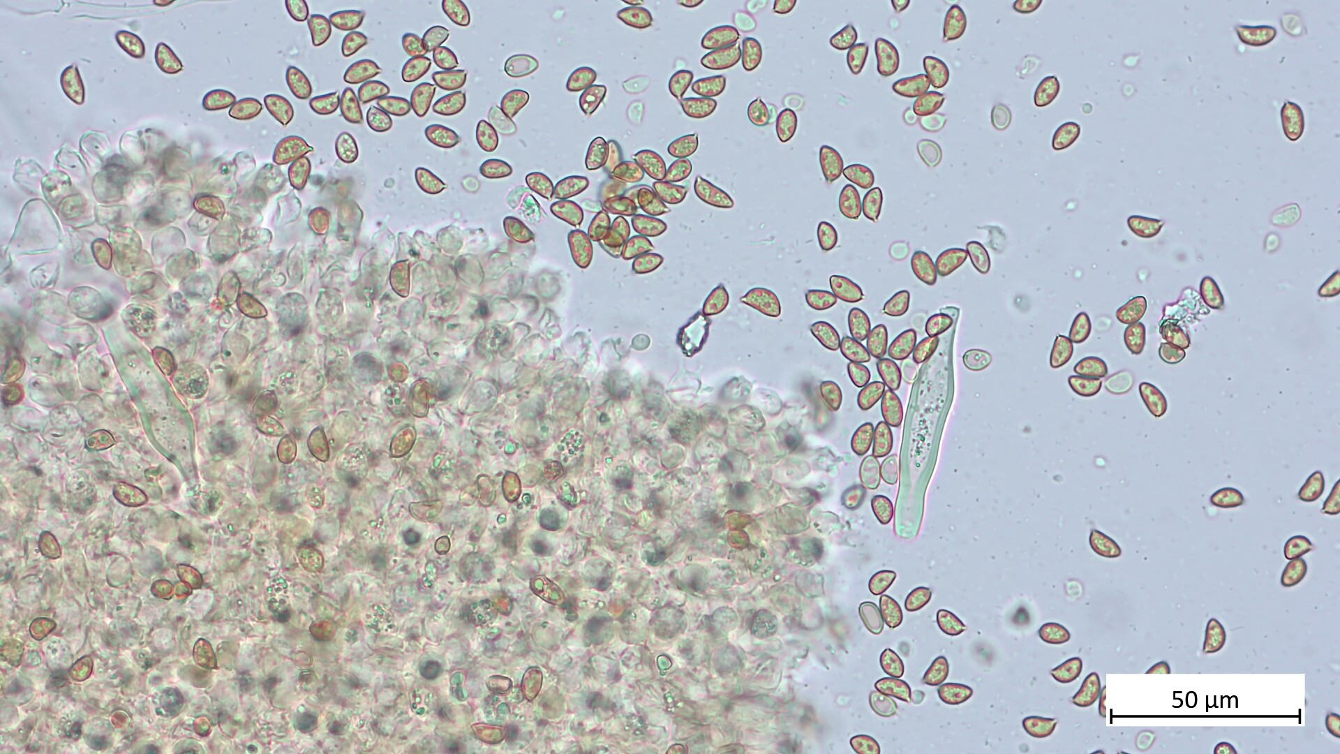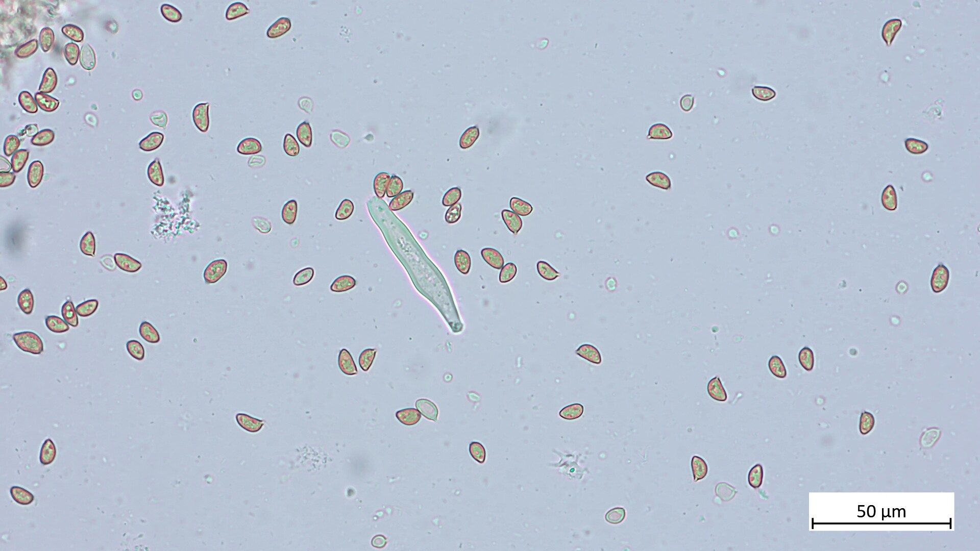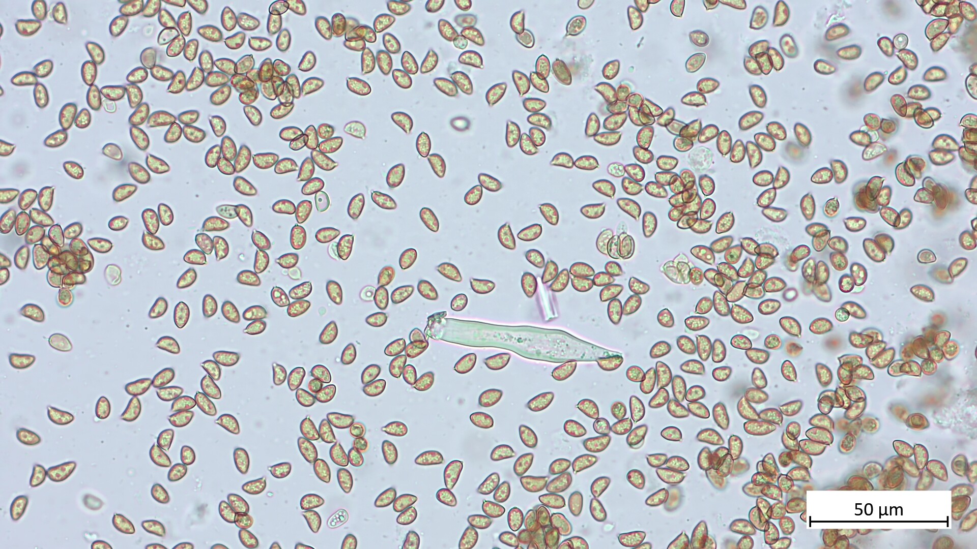 Ich habe 38 Sporen gemessen: 9.1 µm (7.6 - 10.2 µm) x 5.3 (4.7 - 6.0 µm), Q = 1.71 (1.43 - 2.00).