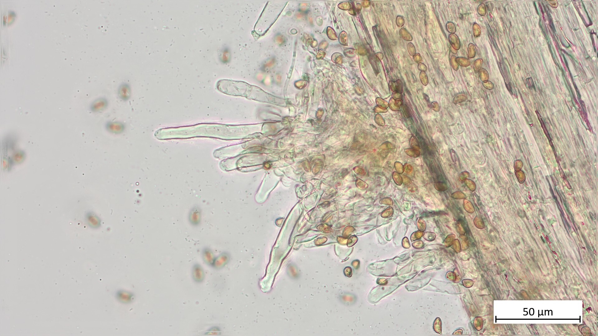 kann schon sein, dass da was geht: Das könnte Inocybe subnudipes sein. Die hat so einen falben Hut, typischerweise so eine eingewachsen faserige Hutoberfläche, und das Habitat passt auch gut. Die Sporen sind im Schnitt etwas schmäler als die von dir gemessenen. Auch die langen, oben welligen Caulos würden passen. Ein guter Beweis wäre, wenn du Zystiden finden würdest, die so aussehen wie die, die ich hier zeige, also mit mehr oder weniger welliger Wand. Schau doch mal nach....