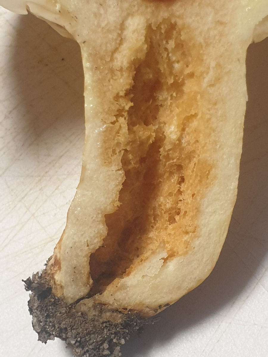 Ein jüngeres Exemplar weist die gleichen Merkmale auf: Oberseite schleimig, Schnittfläche leicht hellbeige/gelblich, keine Flüssigkeit, Stiel auch hier schon innen hohl.