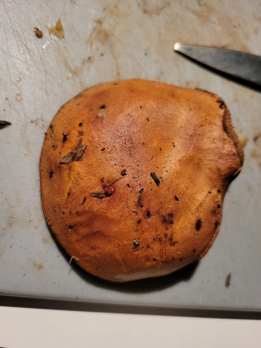 Das Habitat war ein Nadelmischwald, angrenzend an einen Nadel- & Laubmischwald. Andere Pilze, die ich dort gesammelt habe, waren Steinpilze, Sandröhrlinge, Butterpilze, Perlpilze, Krause Glucke, Maronen und einige Trompetenpfifferlinge, falls das weiterhilft. Der Hut ist etwa 8,5 cm breit an der breitesten Stelle, also für Pfefferröhrling eigentlich zu groß, obwohl ich noch ein weiteres Exemplar mitgenommen habe, das größentechnisch eher passen würde (etwa 4 cm). Den Geruch würde ich als würzig, evtl. eine Spur fruchtig beschreiben.